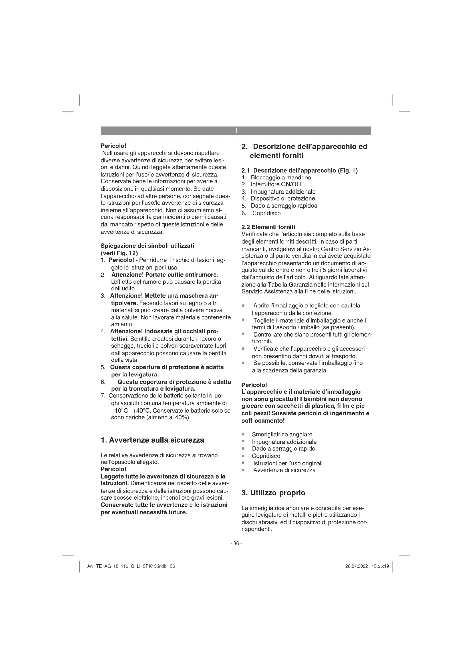 La smerigliatrice angolare è concepita per ese- guire levigature di metalli e pietre utilizzando i dischi abrasivi ed il dispositivo di protezione cor- rispondenti. Anl_TE_AG_18_115_Q_Li_SPK13.indb 36Anl_TE_AG_18_115_Q_Li_SPK13.indb 36 26.07.2022 13:55:1926.07.2022 13:55:19I
