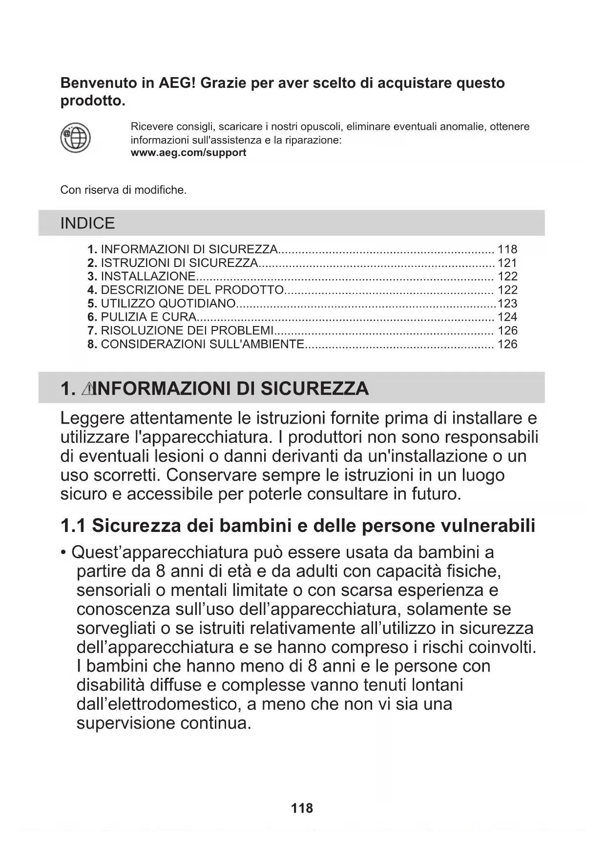 - Quest’apparecchiatura può essere usata da bambini a partire da 8 anni di età e da adulti con capacità fisiche, sensoriali o mentali limitate o con scarsa esperienza e conoscenza sull’uso dell’apparecchiatura, solamente se sorvegliati o se istruiti relativamente all’utilizzo in sicurezza dell’apparecchiatura e se hanno compreso i rischi coinvolti. I bambini che hanno meno di 8 anni e le persone con disabilità diffuse e complesse vanno tenuti lontani dall’elettrodomestico, a meno che non vi sia una supervisione continua. 118• Controllare che i bambini non giochino con l’apparecchiatura.