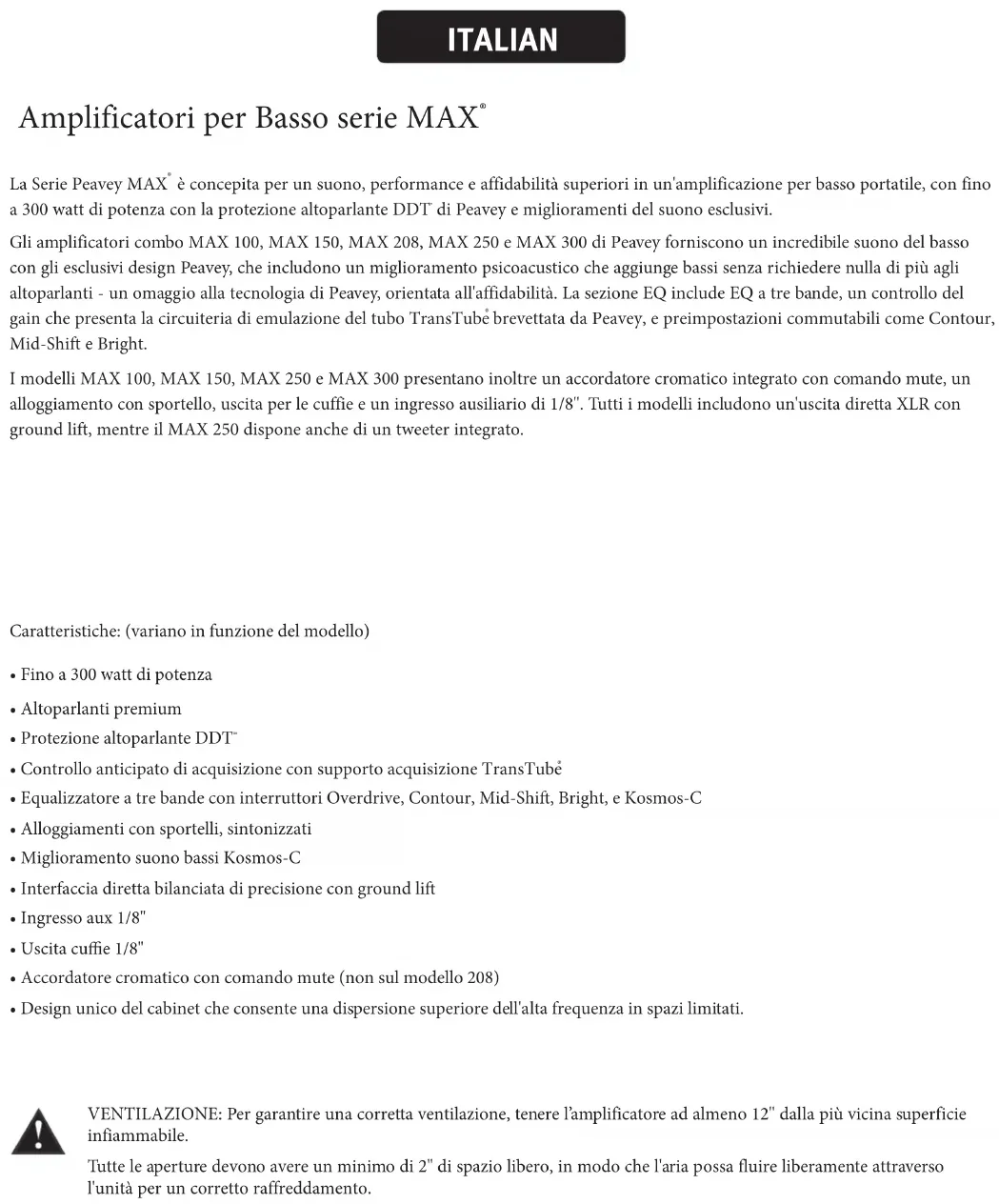 brevettata da Peavey, e preimpostazioni commutabili come Contour, Mid-Shift e Bright. I modelli MAX 100, MAX 150, MAX 250 e MAX 300 presentano inoltre un accordatore cromatico integrato con comando mute, un alloggiamento con sportello, uscita per le cuffie e un ingresso ausiliario di 1/8''. Tutti i modelli includono un'uscita diretta XLR con ground lift, mentre il MAX 250 dispone anche di un tweeter integrato. Caratteristiche: (variano in funzione del modello)