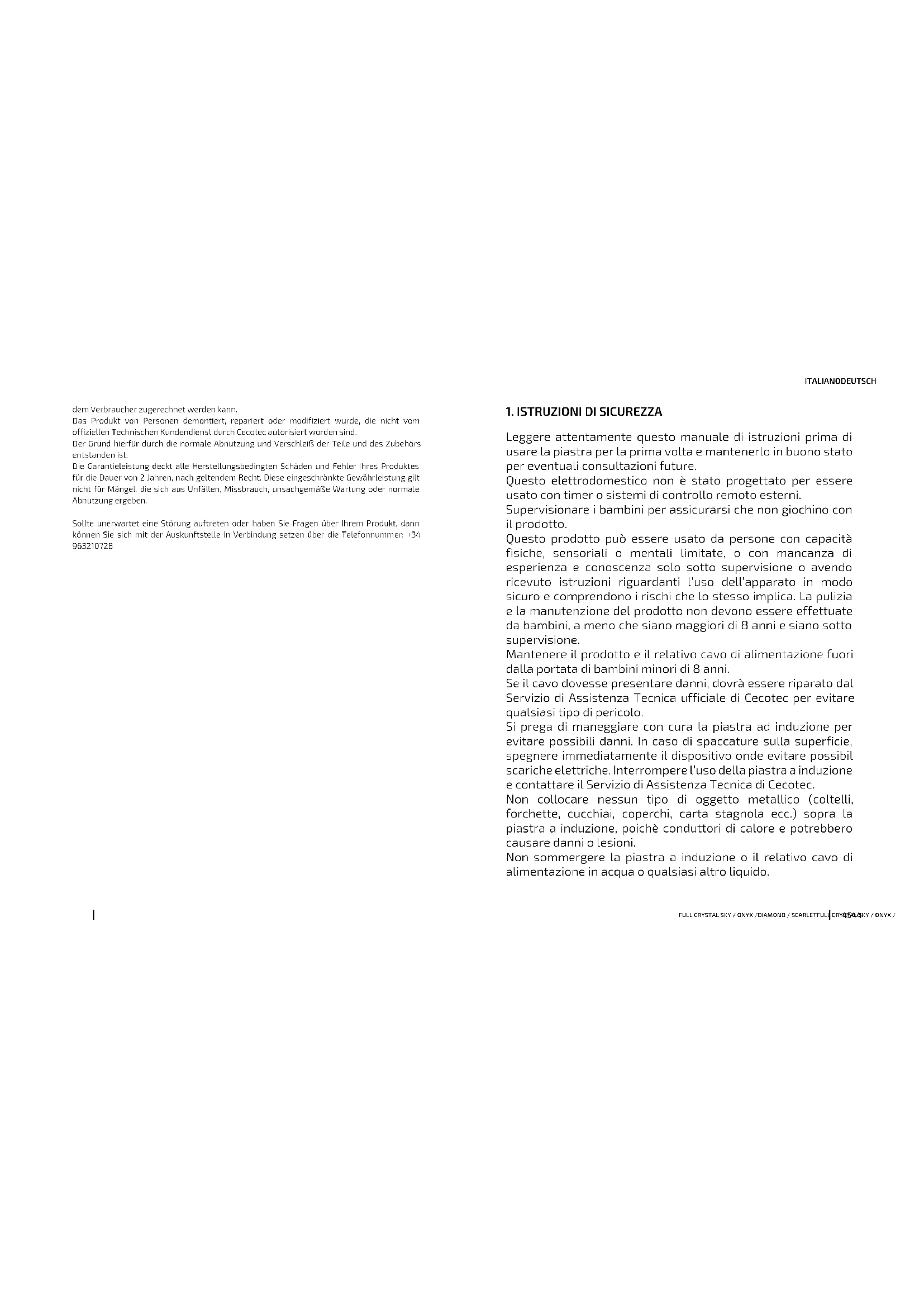 Leggere attentamente questo manuale di istruzioni prima di usare la piastra per la prima volta e mantenerlo in buono stato per eventuali consultazioni future. Questo elettrodomestico non è stato progettato per essere usato con timer o sistemi di controllo remoto esterni. Supervisionare i bambini per assicurarsi che non giochino con il prodotto. Questo prodotto può essere usato da persone con capacità fisiche, sensoriali o mentali limitate, o con mancanza di esperienza e conoscenza solo sotto supervisione o avendo ricevuto istruzioni riguardanti l’uso dell’apparato in modo sicuro e comprendono i rischi che lo stesso implica. La pulizia e la manutenzione del prodotto non devono essere effettuate da bambini, a meno che siano maggiori di 8 anni e siano sotto supervisione. Mantenere il prodotto e il relativo cavo di alimentazione fuori dalla portata di bambini minori di 8 anni. Se il cavo dovesse presentare danni, dovrà essere riparato dal Servizio di Assistenza Tecnica ufficiale di Cecotec per evitare qualsiasi tipo di pericolo. Si prega di maneggiare con cura la piastra ad induzione per evitare possibili danni. In caso di spaccature sulla superficie, spegnere immediatamente il dispositivo onde evitare possibil scariche elettriche. Interrompere l’uso della piastra a induzione e contattare il Servizio di Assistenza Tecnica di Cecotec. Non collocare nessun tipo di oggetto metallico (coltelli, forchette, cucchiai, coperchi, carta stagnola ecc.) sopra la piastra a induzione, poichè conduttori di calore e potrebbero causare danni o lesioni. Non sommergere la piastra a induzione o il relativo cavo di alimentazione in acqua o qualsiasi altro liquido.FULL CRYSTAL SKY / ONYX /DIAMOND / SCARLETFULL CRYSTAL SKY / ONYX /DIAMOND / SCARLET