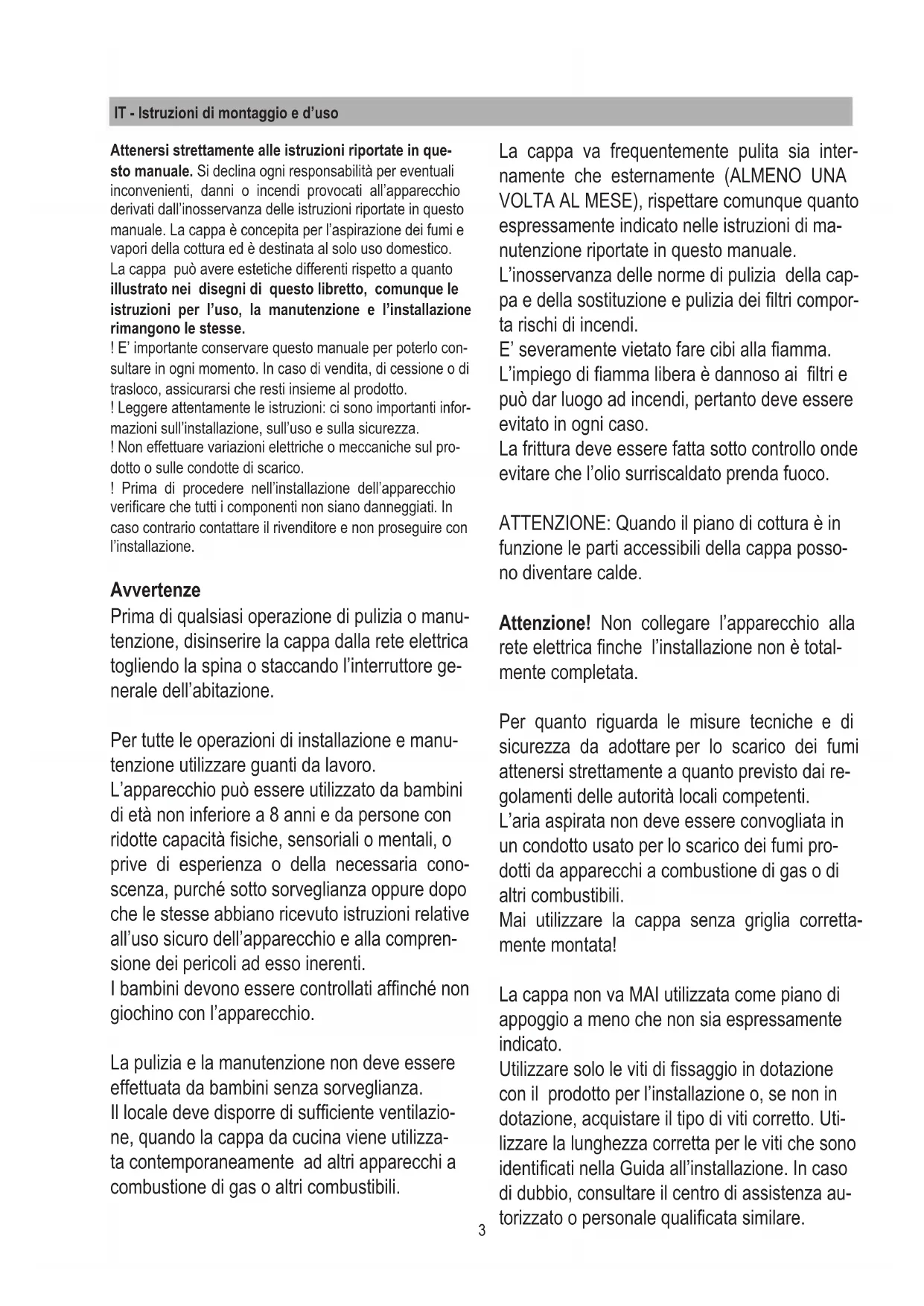 Tizio1 Fig. 1 Fig. 2 Fig. 3 Fig. 4 Fig. 5 Fig. 62 Fig. 7 Fig. 8 Fig. 9 Fig.10 Fig. 11 Fig. 123 IT - Istruzioni di montaggio e d’uso Attenersi strettamente alle istruzioni riportate in que- sto manuale. Si declina ogni responsabilità per eventuali inconvenienti, danni o incendi provocati all’apparecchio derivati dall’inosservanza delle istruzioni riportate in questo manuale. La cappa è concepita per l’aspirazione dei fumi e vapori della cottura ed è destinata al solo uso domestico. La cappa può avere estetiche differenti rispetto a quanto illustrato nei disegni di questo libretto, comunque le istruzioni per l’uso, la manutenzione e l’installazione rimangono le stesse. ! E’ importante conservare questo manuale per poterlo con- sultare in ogni momento. In caso di vendita, di cessione o di trasloco, assicurarsi che resti insieme al prodotto. ! Leggere attentamente le istruzioni: ci sono importanti infor- mazioni sull’installazione, sull’uso e sulla sicurezza. ! Non effettuare variazioni elettriche o meccaniche sul pro- dotto o sulle condotte di scarico. ! Prima di procedere nell’installazione dell’apparecchio vericare che tutti i componenti non siano danneggiati. In caso contrario contattare il rivenditore e non proseguire con l’installazione. Avvertenze Prima di qualsiasi operazione di pulizia o manu- tenzione, disinserire la cappa dalla rete elettrica togliendo la spina o staccando l’interruttore ge- nerale dell’abitazione. Per tutte le operazioni di installazione e manu- tenzione utilizzare guanti da lavoro. L’apparecchio può essere utilizzato da bambini di età non inferiore a 8 anni e da persone con ridotte capacità siche, sensoriali o mentali, o prive di esperienza o della necessaria cono- scenza, purché sotto sorveglianza oppure dopo che le stesse abbiano ricevuto istruzioni relative all’uso sicuro dell’apparecchio e alla compren- sione dei pericoli ad esso inerenti. I bambini devono essere controllati afnché non giochino con l’apparecchio. La pulizia e la manutenzione non deve essere effettuata da bambini senza sorveglianza. Il locale deve disporre di sufciente ventilazio- ne, quando la cappa da cucina viene utilizza- ta contemporaneamente ad altri apparecchi a combustione di gas o altri combustibili. La cappa va frequentemente pulita sia inter- namente che esternamente (ALMENO UNA VOLTA AL MESE), rispettare comunque quanto espressamente indicato nelle istruzioni di ma- nutenzione riportate in questo manuale. L’inosservanza delle norme di pulizia della cap- pa e della sostituzione e pulizia dei ltri compor- ta rischi di incendi. E’ severamente vietato fare cibi alla amma. L’impiego di amma libera è dannoso ai ltri e può dar luogo ad incendi, pertanto deve essere evitato in ogni caso. La frittura deve essere fatta sotto controllo onde evitare che l’olio surriscaldato prenda fuoco. ATTENZIONE: Quando il piano di cottura è in funzione le parti accessibili della cappa posso- no diventare calde. Attenzione! Non collegare l’apparecchio alla rete elettrica nche l’installazione non è total- mente completata. Per quanto riguarda le misure tecniche e di sicurezza da adottare per lo scarico dei fumi attenersi strettamente a quanto previsto dai re- golamenti delle autorità locali competenti. L’aria aspirata non deve essere convogliata in un condotto usato per lo scarico dei fumi pro- dotti da apparecchi a combustione di gas o di altri combustibili. Mai utilizzare la cappa senza griglia corretta- mente montata! La cappa non va MAI utilizzata come piano di appoggio a meno che non sia espressamente indicato. Utilizzare solo le viti di ssaggio in dotazione con il prodotto per l’installazione o, se non in dotazione, acquistare il tipo di viti corretto. Uti- lizzare la lunghezza corretta per le viti che sono identicati nella Guida all’installazione. In caso di dubbio, consultare il centro di assistenza au- torizzato o personale qualicata similare.4 ATTENZIONE! La mancata installazione di viti e dispositivi di ssaggio in conformità di queste istruzioni può comportare rischi di natura elet- trica. Si declina ogni responsabilità per eventuali in- convenienti, danni o incendi provocati all’appa- recchio derivati dall’inosservanza delle istruzio- ni riportate in questo manuale. Nell’intento costante di migliorare i nostri pro- dotti, ci riserviamo il diritto di apportare alle loro caratteristiche tecniche, funzionali o estetiche tutte le modiche derivanti dalla loro evoluzio- ne. Nel caso di versione con motore esterno, per il normale funzionamento della cappa è ne- cessario utilizzare un gruppo aspirante (motore esterno) della stessa casa produttrice. Questo apparecchio è contrassegnato in con- formità alla Direttiva Europea 2012/19/EC, Waste Electrical and Electronic Equipment (WEEE). Assicurandosi che questo prodotto sia smaltito in modo corretto, l’utente contribuisce a prevenire le potenziali conseguenze negative per l’ambiente e la salute. Il simbolo sul prodotto o sulla documenta- zione di accompagnamento indica che questo prodotto non deve essere trattato come riuto domestico ma deve essere consegnato pres- so l’idoneo punto di raccolta per il riciclaggio di apparecchiature elettriche ed elettroniche. Disfarsene seguendo le normative locali per lo smaltimento dei riuti. Per ulteriori informazioni sul trattamento, recupero e riciclaggio di questo prodotto, contattare l’idoneo ufcio locale, il ser- vizio di raccolta dei riuti domestici o il negozio presso il quale il prodotto è stato acquistato. Apparecchiatura progettata, testata e realizzata nel rispetto delle norme sulla: