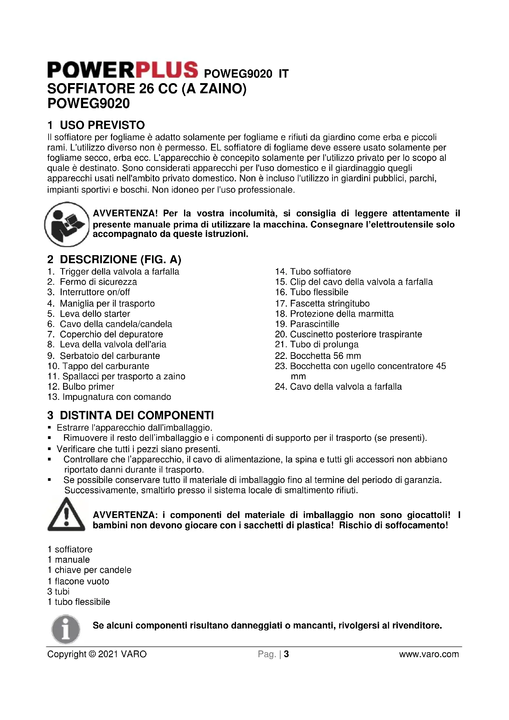 Copyright © 2021 VARO Pag. | 3 www.varo.com SOFFIATORE 26 CC (A ZAINO) POWEG9020 1 USO PREVISTO Il soffiatore per fogliame è adatto solamente per fogliame e rifiuti da giardino come erba e piccoli rami. L'utilizzo diverso non è permesso. EL soffiatore di fogliame deve essere usato solamente per fogliame secco, erba ecc. L'apparecchio è concepito solamente per l'utilizzo privato per lo scopo al quale è destinato. Sono considerati apparecchi per l'uso domestico e il giardinaggio quegli apparecchi usati nell'ambito privato domestico. Non è incluso l'utilizzo in giardini pubblici, parchi, impianti sportivi e boschi. Non idoneo per l'uso professionale. AVVERTENZA! Per la vostra incolumità, si consiglia di leggere attentamente il presente manuale prima di utilizzare la macchina. Consegnare l’elettroutensile solo accompagnato da queste istruzioni. 2 DESCRIZIONE (FIG. A)