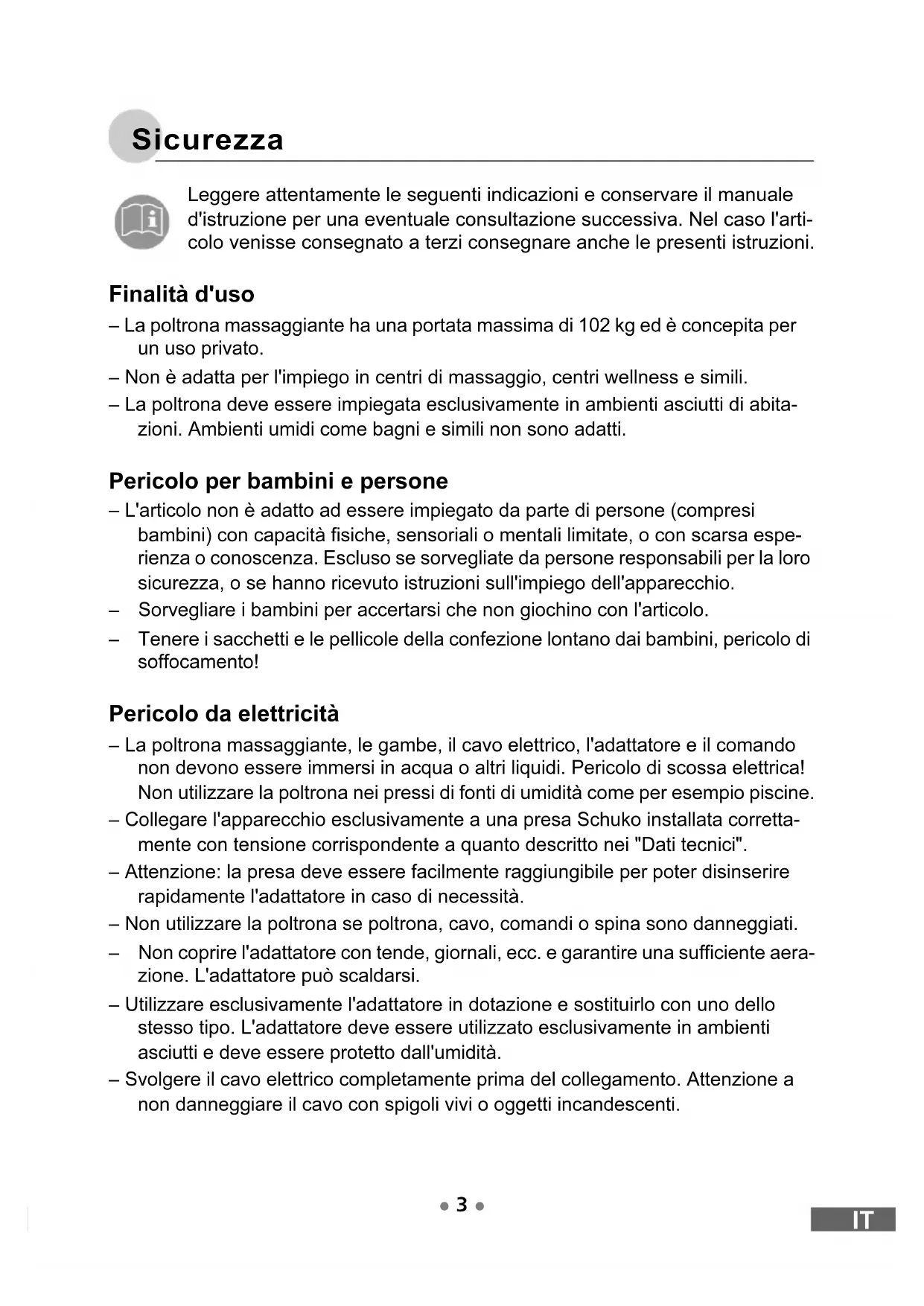 Sicurezza Leggere attentamente le seguenti indicazioni e conservare il manuale d'istruzione per una eventuale consultazione successiva. Nel caso l'arti- colo venisse consegnato a terzi consegnare anche le presenti istruzioni. Finalità d'uso – La poltrona massaggiante ha una portata massima di 102 kg ed è concepita per un uso privato. – Non è adatta per l'impiego in centri di massaggio, centri wellness e simili. – La poltrona deve essere impiegata esclusivamente in ambienti asciutti di abita- zioni. Ambienti umidi come bagni e simili non sono adatti. Pericolo per bambini e persone – L'articolo non è adatto ad essere impiegato da parte di persone (compresi bambini) con capacità fisiche, sensoriali o mentali limitate, o con scarsa espe- rienza o conoscenza. Escluso se sorvegliate da persone responsabili per la loro sicurezza, o se hanno ricevuto istruzioni sull'impiego dell'apparecchio. – Sorvegliare i bambini per accertarsi che non giochino con l'articolo. – Tenere i sacchetti e le pellicole della confezione lontano dai bambini, pericolo di soffocamento! Pericolo da elettricità – La poltrona massaggiante, le gambe, il cavo elettrico, l'adattatore e il comando non devono essere immersi in acqua o altri liquidi. Pericolo di scossa elettrica! Non utilizzare la poltrona nei pressi di fonti di umidità come per esempio piscine. – Collegare l'apparecchio esclusivamente a una presa Schuko installata corretta- mente con tensione corrispondente a quanto descritto nei "Dati tecnici". – Attenzione: la presa deve essere facilmente raggiungibile per poter disinserire rapidamente l'adattatore in caso di necessità. – Non utilizzare la poltrona se poltrona, cavo, comandi o spina sono danneggiati. – Non coprire l'adattatore con tende, giornali, ecc. e garantire una sufficiente aera- zione. L'adattatore può scaldarsi. – Utilizzare esclusivamente l'adattatore in dotazione e sostituirlo con uno dello stesso tipo. L'adattatore deve essere utilizzato esclusivamente in ambienti asciutti e deve essere protetto dall'umidità. – Svolgere il cavo elettrico completamente prima del collegamento. Attenzione a non danneggiare il cavo con spigoli vivi o oggetti incandescenti. IT Massagesessel.book Seite 3 Dienstag, 3. November 2009 3:58 15 4 – Estrarre l'adattatore dalla presa elettrica quando: - la funzione massaggio non viene utilizzata, - dopo ogni utilizzo, - prima di pulire, spostare o riporre la poltrona, - durante evidenti problemi durante l'uso, - temporali. Estrarre l'adattatore evitando di tirare il cavo. – Non effettuare modifiche sull'articolo o sul cavo di collegamento. Far eseguire le riparazioni da un centro specializzato, le riparazioni inadeguate possono mettere in pericolo l'utente. Si veda anche le condizioni per la garanzia allegate. – Per collegare la poltrona e lo sgabello, utilizzare solo i cavi originali inclusi nella fornitura.Per motivi di compatibilità elettromagnetica i cavi uscenti non devono essere allungati. – Il cavo dell'adattatore non può essere sostituito. In caso di danni al cavo o all'adattatore questi devono essere smaltiti e sostituiti da un adattatore dello stesso tipo. – Attenzione: durante la pulizia evitare che dei liquidi entrino all'interno della poltrona. Pericolo di ferite – Usare cautela reclinando o sollevando lo schienale. Pericolo di schiacciamento! – Usare cautela durante il trasporto del poggiapiedi. Piedistallo e asse del poggia- piedi sono solo innestati. Trasportare il poggiapiedi in modo che il piedistallo non possa cadere. Pericolo di ferite e danni materiali! – Interrompere il massaggio se dovesse avere nausea, vertigini o sentirsi debole. – In caso di sintomi più intensi o persistenti come per. es. dolori articolari o al petto, tachicardia, ecc. consultare il medico. – La durata del massaggio non deve superare i 15 minuti. Un massaggio più prolungato può provocare contratture muscolari. – Posizionare Il cavo elettrico in modo che non possa provocare pericolo di inciam- pare. IT Massagesessel.book Seite 4 Dienstag, 3. November 2009 3:58 15 5