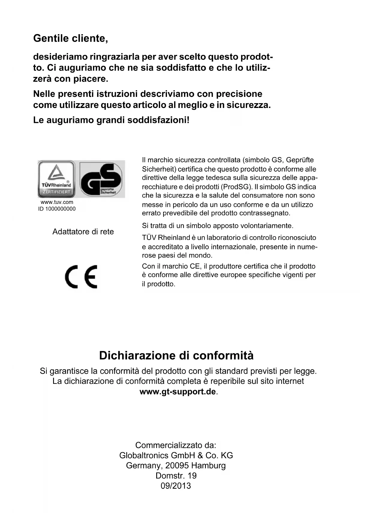 Gesamtbuch.book Seite 56 Mittwoch, 3. Juli 2013 1:44 13Istruzioni all'uso Sedia con massaggio a sfere Periodo promozione: 09/2013, tipo: GT-MS-06 manuale originale Gesamtbuch.book Seite 57 Mittwoch, 3. Juli 2013 1:44 13Dichiarazione di conformità Si garantisce la conformità del prodotto con gli standard previsti per legge. La dichiarazione di conformità completa è reperibile sul sito internet www.gt-support.de. Commercializzato da: Globaltronics GmbH & Co. KG Germany, 20095 Hamburg Domstr. 19 09/2013 Gentile cliente, desideriamo ringraziarla per aver scelto questo prodot- to. Ci auguriamo che ne sia soddisfatto e che lo utiliz- zerà con piacere. Nelle presenti istruzioni descriviamo con precisione come utilizzare questo articolo al meglio e in sicurezza. Le auguriamo grandi soddisfazioni! Il marchio sicurezza controllata (simbolo GS, Geprüfte Sicherheit) certifica che questo prodotto è conforme alle direttive della legge tedesca sulla sicurezza delle appa-recchiature e dei prodotti (ProdSG). Il simbolo GS indica che la sicurezza e la salute del consumatore non sono messe in pericolo da un uso conforme e da un utilizzo errato prevedibile del prodotto contrassegnato.Si tratta di un simbolo apposto volontariamente.TÜV Rheinland è un laboratorio di controllo riconosciuto e accreditato a livello internazionale, presente in nume-rose paesi del mondo.Con il marchio CE, il produttore certifica che il prodotto è conforme alle direttive europee specifiche vigenti per il prodotto. www.tuv.comID 1000000000 Adattatore di rete Gesamtbuch.book Seite 58 Mittwoch, 3. Juli 2013 1:44 1359 Sedia con massaggio a sfere Volume di fornitura