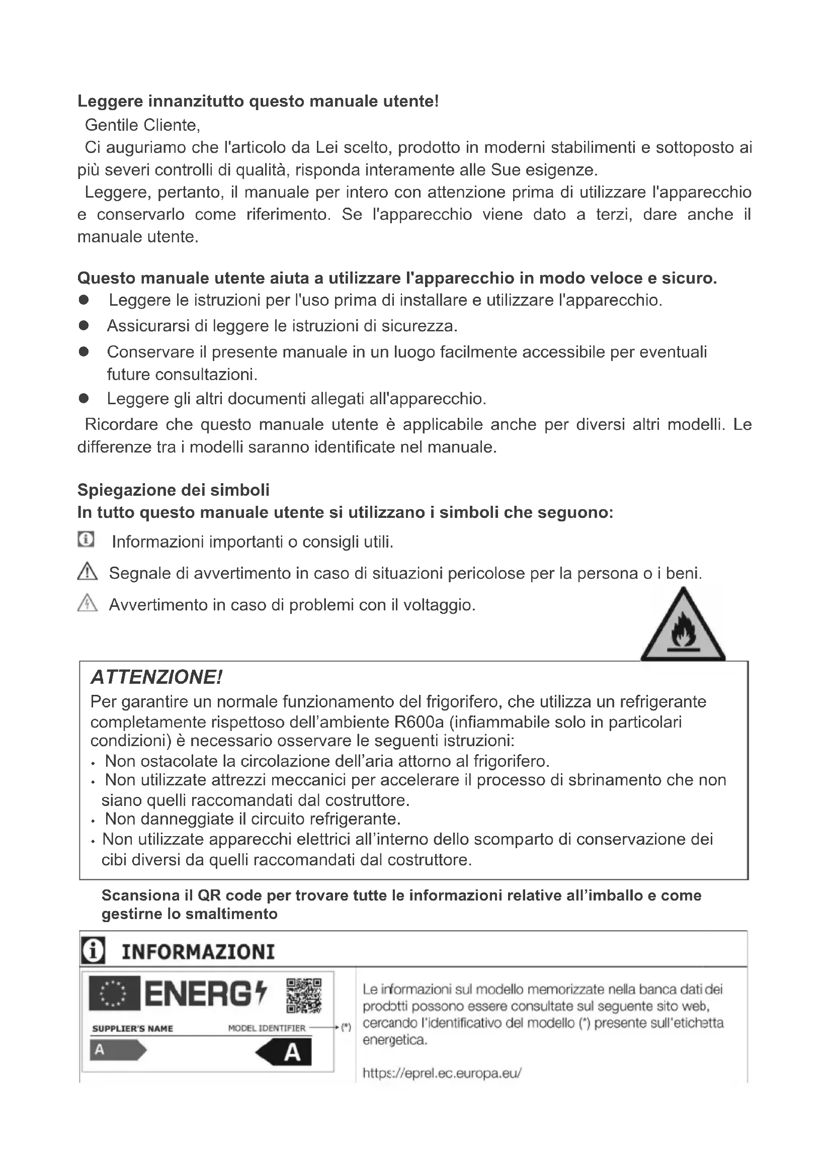 - Živila se dotikajo stropa predala. >>>Ponovno razporedite živila v predalu.Leggere innanzitutto questo manuale utente! Gentile Cliente, Ci auguriamo che l'articolo da Lei scelto, prodotto in moderni stabilimenti e sottoposto ai più severi controlli di qualità, risponda interamente alle Sue esigenze. Leggere, pertanto, il manuale per intero con attenzione prima di utilizzare l'apparecchio e conservarlo come riferimento. Se l'apparecchio viene dato a terzi, dare anche il manuale utente. Questo manuale utente aiuta a utilizzare l'apparecchio in modo veloce e sicuro. z Leggere le istruzioni per l'uso prima di installare e utilizzare l'apparecchio. z Assicurarsi di leggere le istruzioni di sicurezza. z Conservare il presente manuale in un luogo facilmente accessibile per eventuali future consultazioni. z Leggere gli altri documenti allegati all'apparecchio. Ricordare che questo manuale utente è applicabile anche per diversi altri modelli. Le differenze tra i modelli saranno identificate nel manuale. Spiegazione dei simboli In tutto questo manuale utente si utilizzano i simboli che seguono: Informazioni importanti o consigli utili. Segnale di avvertimento in caso di situazioni pericolose per la persona o i beni. Avvertimento in caso di problemi con il voltaggio. ATTENZIONE! Per garantire un normale funzionamento del frigorifero, che utilizza un refrigerante completamente rispettoso dell’ambiente R600a (infiammabile solo in particolari condizioni) è necessario osservare le seguenti istruzioni: Non ostacolate la circolazione dell’aria attorno al frigorifero. Non utilizzate attrezzi meccanici per accelerare il processo di sbrinamento che non siano quelli raccomandati dal costruttore. Non danneggiate il circuito refrigerante. Non utilizzate apparecchi elettrici all’interno dello scomparto di conservazione dei cibi diversi da quelli raccomandati dal costruttore. Scansiona il QR code per trovare tutte le informazioni relative all’imballo e come gestirne lo smaltimento1 Il frigorifero 3 2 Importanti avvertenze per la sicurezza 4 Uso previsto …………………….……. 4 Sicurezza generale …… ………….…. 4 Per apparecchi dotati di erogatore di acqua ………………………………... 6 Sicurezza bambini ………………….... 6 Conformità al regolamento WEEE e allo smaltimento dei rifiuti …………. 6 Informazioni di imballaggio ………….. 7 Avvertenza HCA ……………………… 7 Cose d a fare per risparmiare energia . 7 3 Installazione