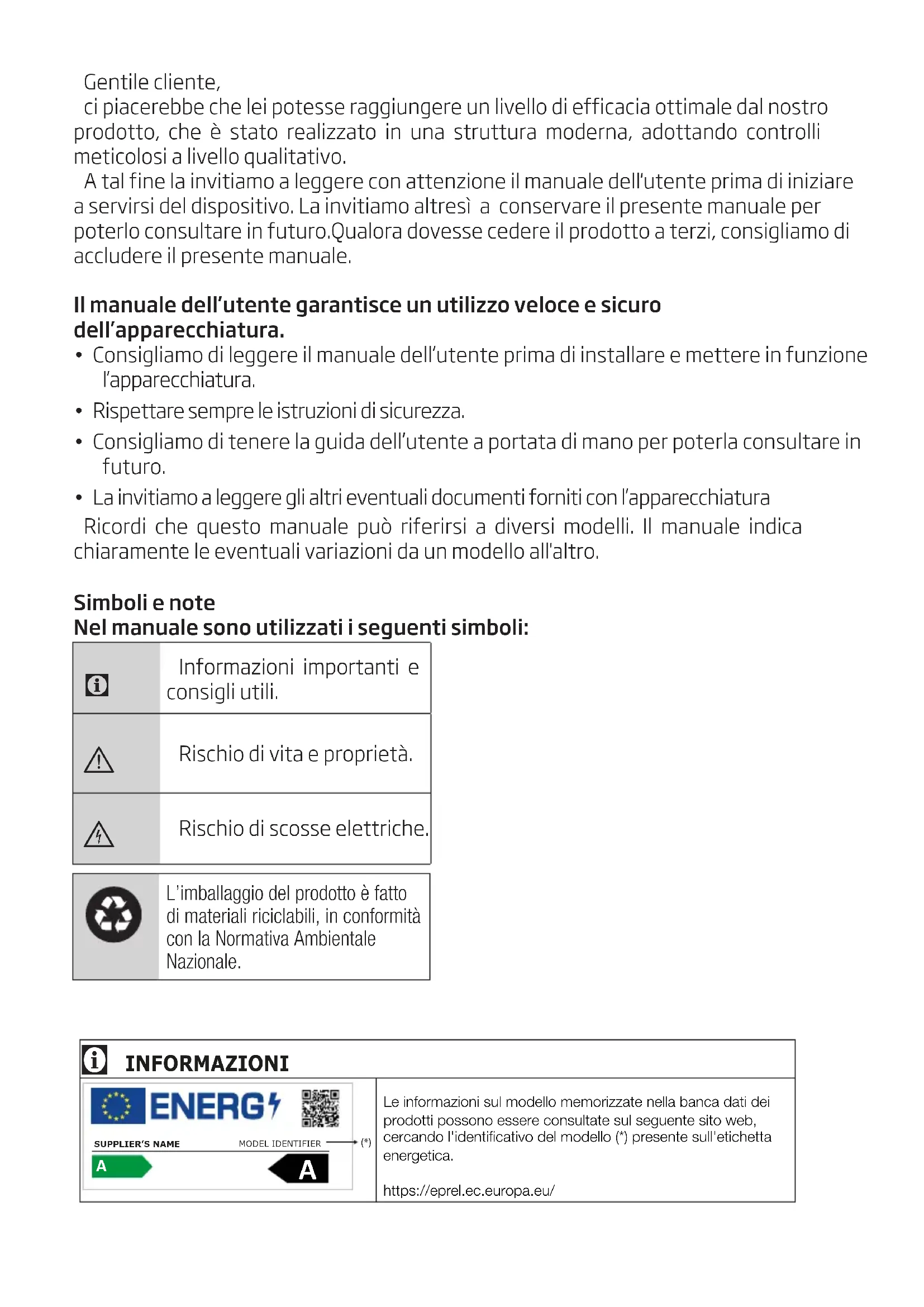 Le informazioni sul modello memorizzate nella banca dati dei prodotti possono essere consultate sul seguente sito web, cercando l'identificativo del modello (*) presente sull'etichetta energetica.https://eprel.ec.europa.eu/