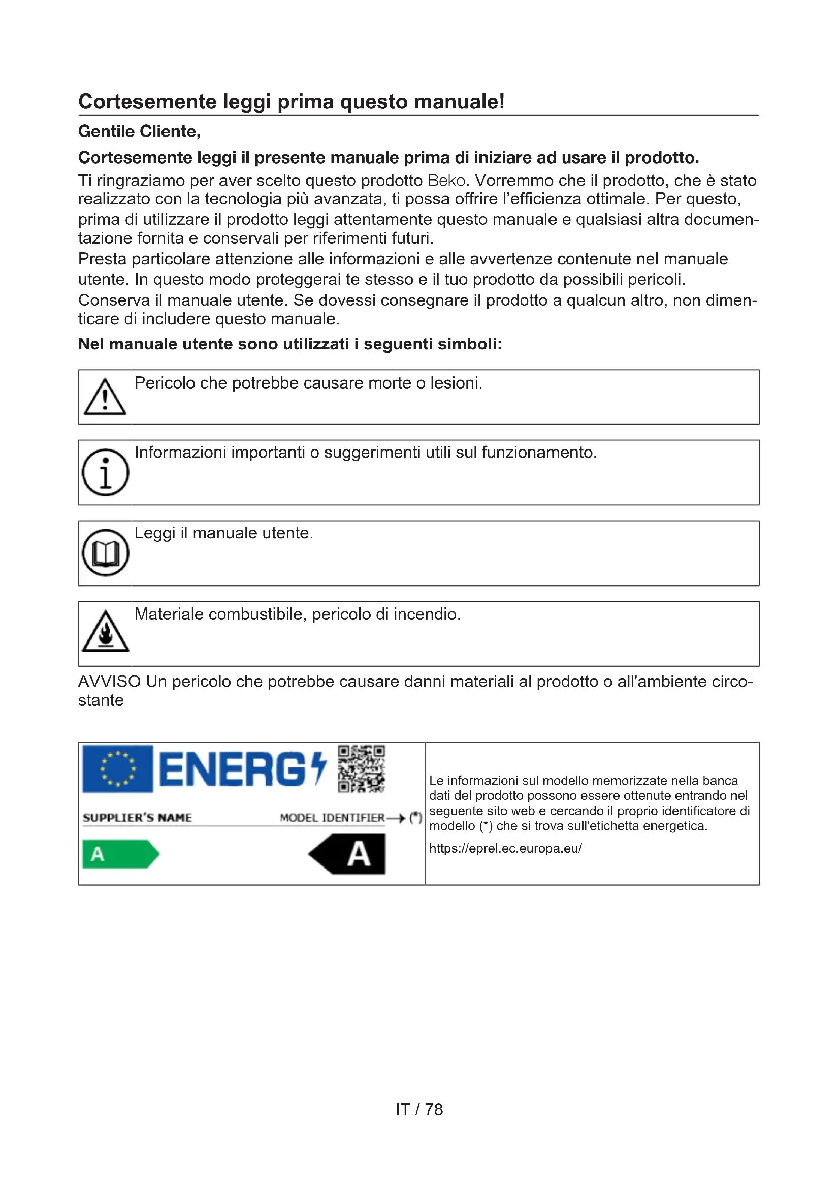 Cortesemente leggi prima questo manuale! Gentile Cliente, Cortesemente leggi il presente manuale prima di iniziare ad usare il prodotto. Ti ringraziamo per aver scelto questo prodotto Beko. Vorremmo che il prodotto, che è stato realizzato con la tecnologia più avanzata, ti possa offrire l’efficienza ottimale. Per questo, prima di utilizzare il prodotto leggi attentamente questo manuale e qualsiasi altra documen- tazione fornita e conservali per riferimenti futuri. Presta particolare attenzione alle informazioni e alle avvertenze contenute nel manuale utente. In questo modo proteggerai te stesso e il tuo prodotto da possibili pericoli. Conserva il manuale utente. Se dovessi consegnare il prodotto a qualcun altro, non dimen- ticare di includere questo manuale. Nel manuale utente sono utilizzati i seguenti simboli: Pericolo che potrebbe causare morte o lesioni. Informazioni importanti o suggerimenti utili sul funzionamento. Leggi il manuale utente. Materiale combustibile, pericolo di incendio. AVVISO Un pericolo che potrebbe causare danni materiali al prodotto o all'ambiente circo- stante Le informazioni sul modello memorizzate nella banca dati del prodotto possono essere ottenute entrando nel seguente sito web e cercando il proprio identificatore di modello (*) che si trova sull'etichetta energetica. https://eprel.ec.europa.eu/IT / 79 1 Istruzioni di sicurezza................... 80