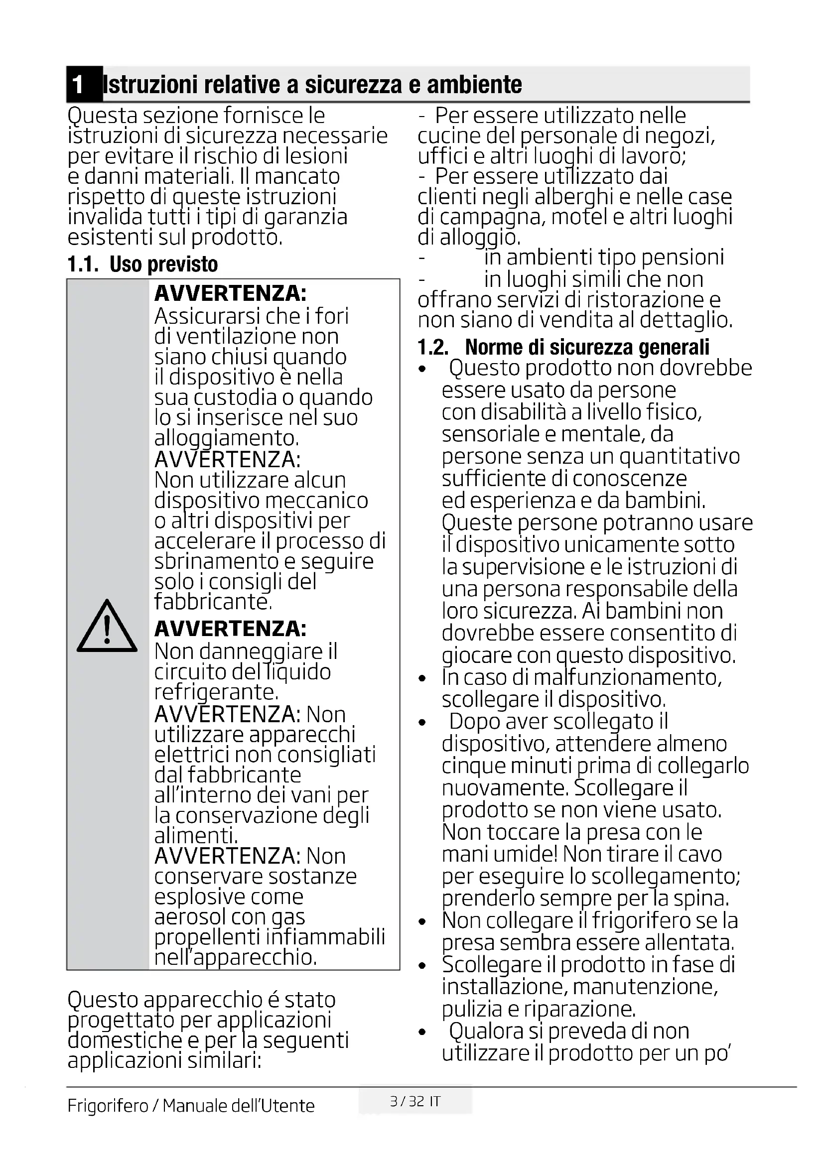 AVVERTENZA: Assicurarsi che i fori di ventilazione non siano chiusi quando il dispositivo è nella sua custodia o quando lo si inserisce nel suo alloggiamento. AVVERTENZA: Non utilizzare alcun dispositivo meccanico o altri dispositivi per accelerare il processo di sbrinamento e seguire solo i consigli del fabbricante. AVVERTENZA: Non danneggiare il circuito del liquido refrigerante. AVVERTENZA: Non utilizzare apparecchi elettrici non consigliati dal fabbricante all’interno dei vani per la conservazione degli alimenti. AVVERTENZA: Non conservare sostanze esplosive come aerosol con gas propellenti infiammabili nell’apparecchio. Questo apparecchio é stato progettato per applicazioni domestiche e per la seguenti applicazioni similari: - Per essere utilizzato nelle cucine del personale di negozi, uffici e altri luoghi di lavoro; - Per essere utilizzato dai clienti negli alberghi e nelle case di campagna, motel e altri luoghi di alloggio. - in ambienti tipo pensioni - in luoghi simili che non offrano servizi di ristorazione e non siano di vendita al dettaglio. 1.2. Norme di sicurezza generali t Questo prodotto non dovrebbe essere usato da persone con disabilità a livello fisico, sensoriale e mentale, da persone senza un quantitativo sufficiente di conoscenze ed esperienza e da bambini. Queste persone potranno usare il dispositivo unicamente sotto la supervisione e le istruzioni di una persona responsabile della loro sicurezza. Ai bambini non dovrebbe essere consentito di giocare con questo dispositivo. t In caso di malfunzionamento, scollegare il dispositivo. t Dopo aver scollegato il dispositivo, attendere almeno cinque minuti prima di collegarlo nuovamente. Scollegare il prodotto se non viene usato. Non toccare la presa con le mani umide! Non tirare il cavo per eseguire lo scollegamento; prenderlo sempre per la spina. t Non collegare il frigorifero se la presa sembra essere allentata. t Scollegare il prodotto in fase di installazione, manutenzione, pulizia e riparazione. t Qualora si preveda di non utilizzare il prodotto per un po’4 / 32 IT Frigorifero / Manuale dell’Utente Istruzioni relativamente a sicurezza e ambiente di tempo, scollegarlo ed estrarre gli eventuali elementi contenuti al suo interno. t Non usare vapore o materiali detergenti a base di vapore per la pulizia del frigorifero e per lo scioglimento del ghiaccio al suo interno. Il vapore potrebbe entrare in contatto con le aree sotto tensione elettrica e causare cortocircuiti o scosse elettriche! t Non lavare il prodotto spruzzando o versando acqua sullo stesso! Pericolo di scossa elettrica! t Non usare mai il prodotto se la sezione che si trova sulla parte superiore o posteriore del prodotto, con le schede dei circuiti elettronici stampati all’interno, è aperta (coprire schede dei circuiti elettronici stampati) (1).