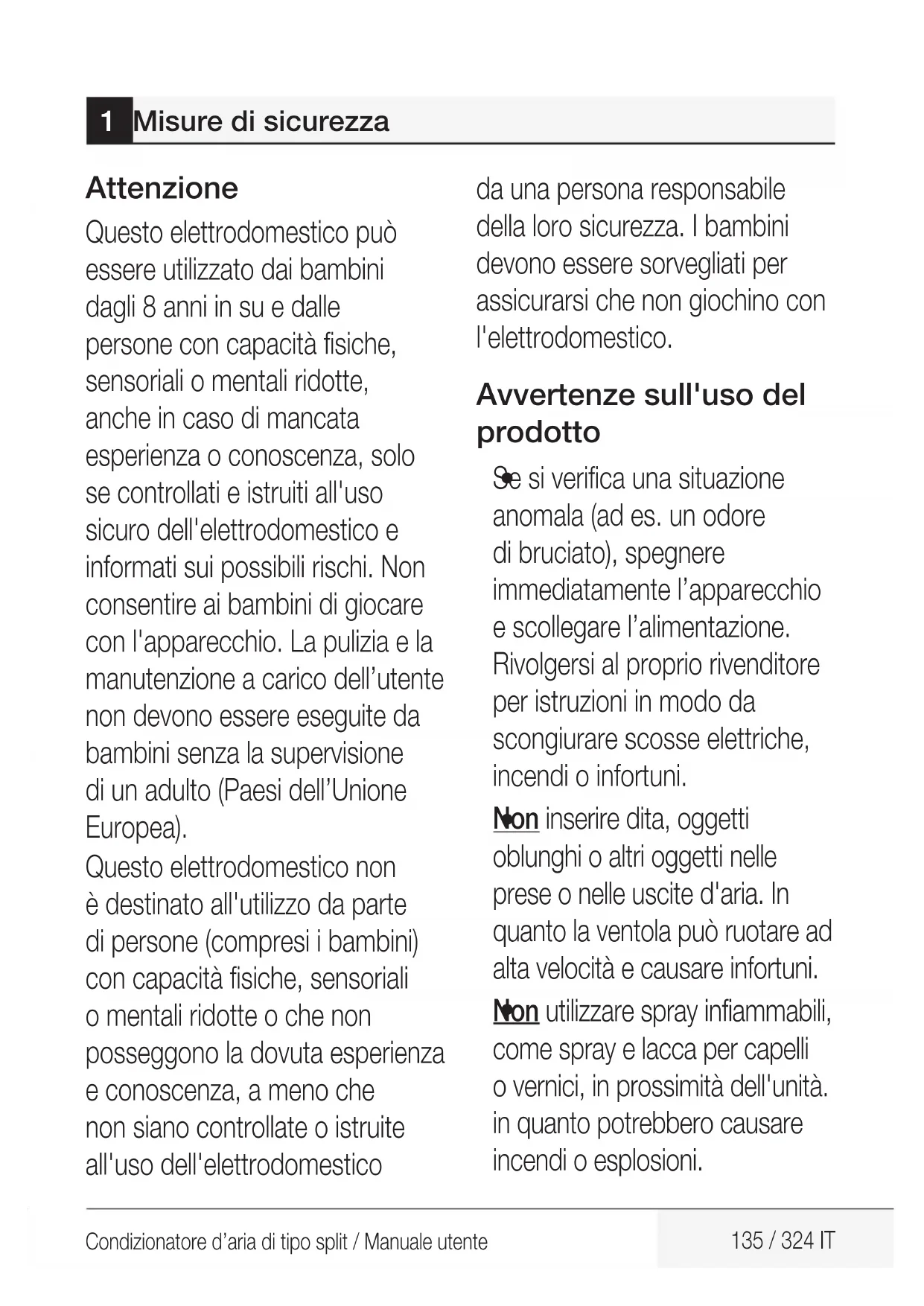 - 14 Normative europee per lo smaltimento 187 15 Istruzioni per l'installazione 188 15.1 Istruzioni per i gas fluorurati 16 Specifiche tecniche 189 134 / 324 IT Condizionatore d’aria di tipo split / Manuale utenteCondizionatore d’aria di tipo split / Manuale utente 135 / 324 IT Attenzione Questo elettrodomestico può essere utilizzato dai bambini dagli 8 anni in su e dalle persone con capacità fisiche, sensoriali o mentali ridotte, anche in caso di mancata esperienza o conoscenza, solo se controllati e istruiti all'uso sicuro dell'elettrodomestico e informati sui possibili rischi. Non consentire ai bambini di giocare con l'apparecchio. La pulizia e la manutenzione a carico dell’utente non devono essere eseguite da bambini senza la supervisione di un adulto (Paesi dell’Unione Europea). Questo elettrodomestico non è destinato all'utilizzo da parte di persone (compresi i bambini) con capacità fisiche, sensoriali o mentali ridotte o che non posseggono la dovuta esperienza e conoscenza, a meno che non siano controllate o istruite all'uso dell'elettrodomestico da una persona responsabile della loro sicurezza. I bambini devono essere sorvegliati per assicurarsi che non giochino con l'elettrodomestico. Avvertenze sull'uso del prodotto p. 188