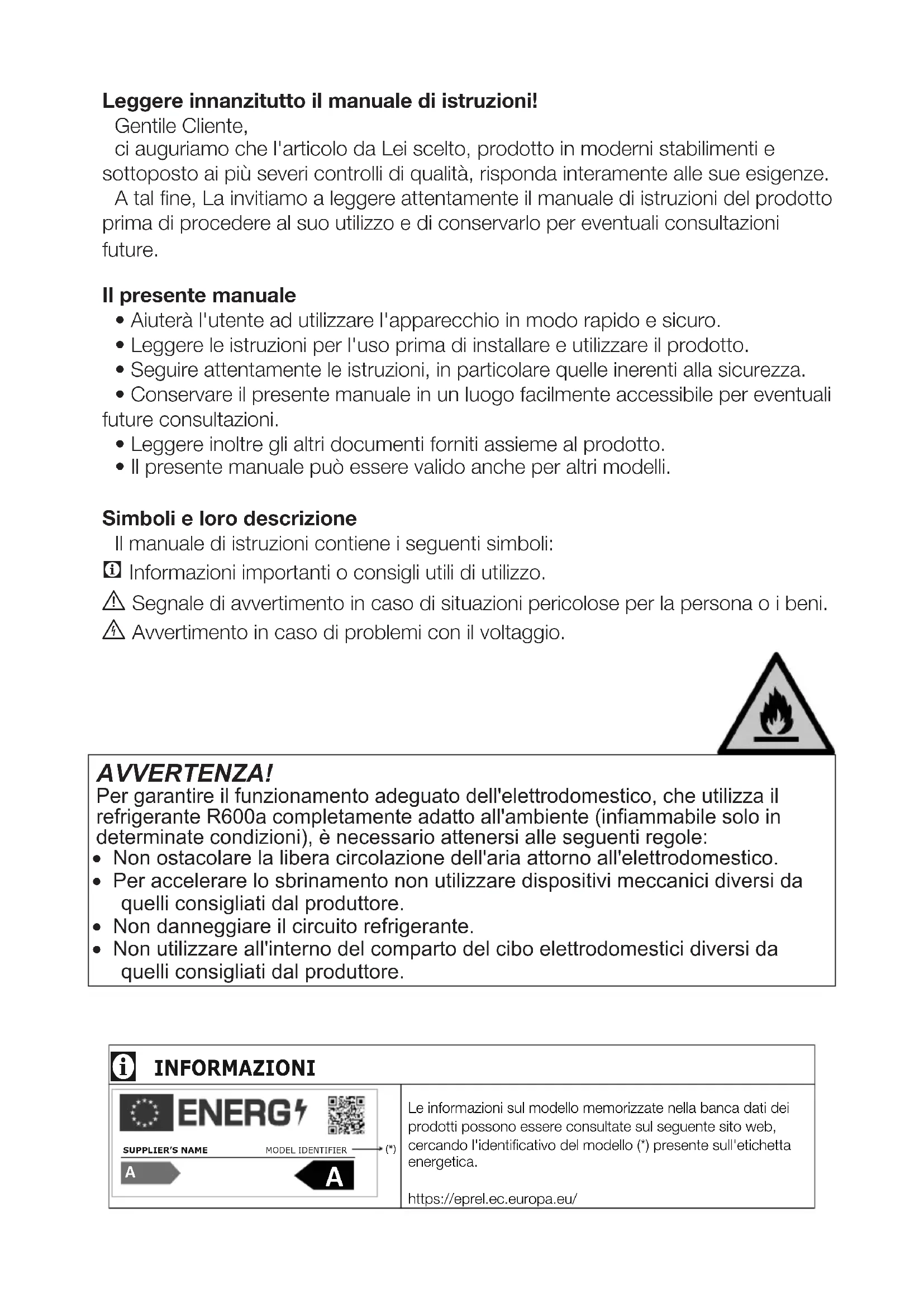 - Il presente manuale può essere valido anche per altri modelli. Simboli e loro descrizione Il manuale di istruzioni contiene i seguenti simboli: C Informazioni importanti o consigli utili di utilizzo. A Segnale di avvertimento in caso di situazioni pericolose per la persona o i beni. B Avvertimento in caso di problemi con il voltaggio. AVVERTENZA! Per garantire il funzionamento adeguato dell'elettrodomestico, che utilizza il refrigerante R600a completamente adatto all'ambiente (infiammabile solo in determinate condizioni), è necessario attenersi alle seguenti regole: