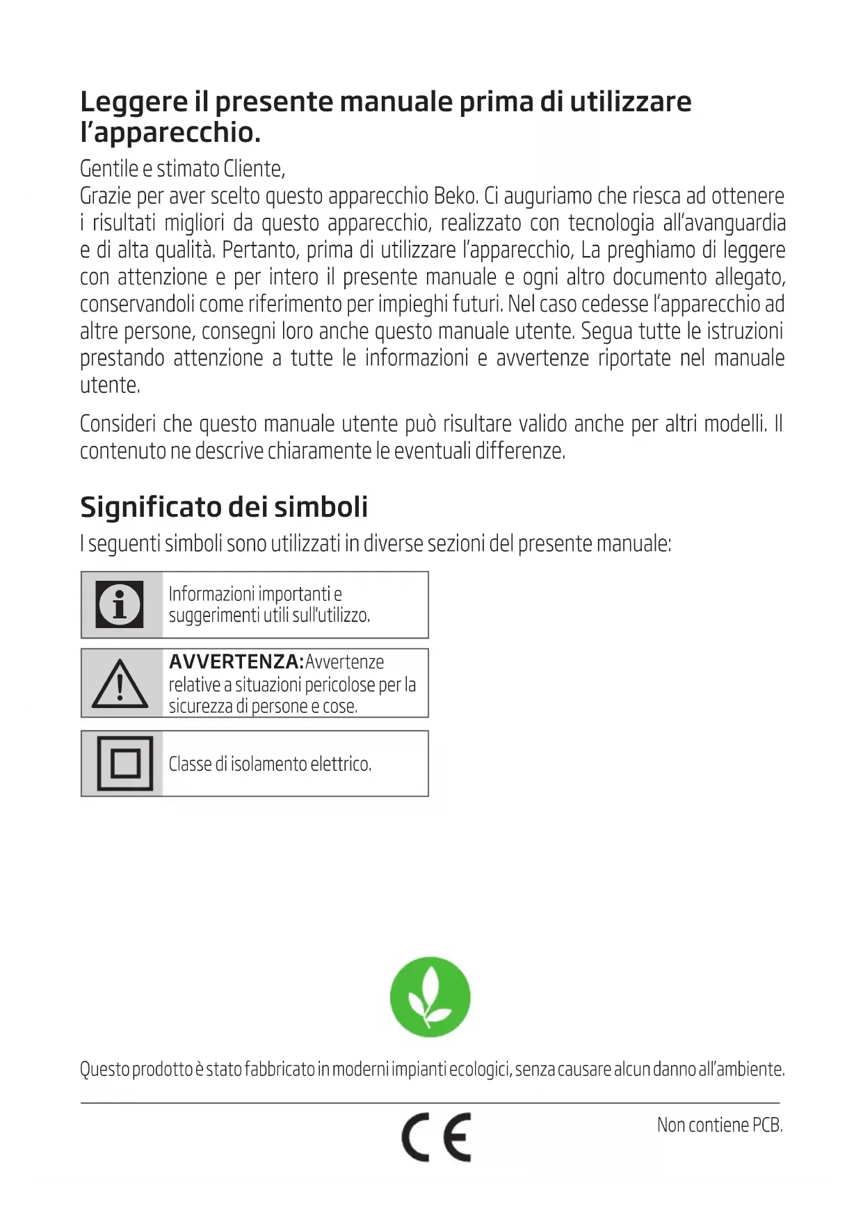 AVVERTENZA: Avvertenze relative a situazioni pericolose per la sicurezza di persone e cose. Classe di isolamento elettrico. Questo prodotto è stato fabbricato in moderni impianti ecologici, senza causare alcun danno all’ambiente. Non contiene PCB.Aspirapolvere / Manuale Utente 59 / IT Questa sezione contiene istruzioni di sicurezza che consentono di prevenire il pericolo di lesioni personali o di danni materiali. L’inosservanza di queste istruzioni invalida la garanzia accordata.