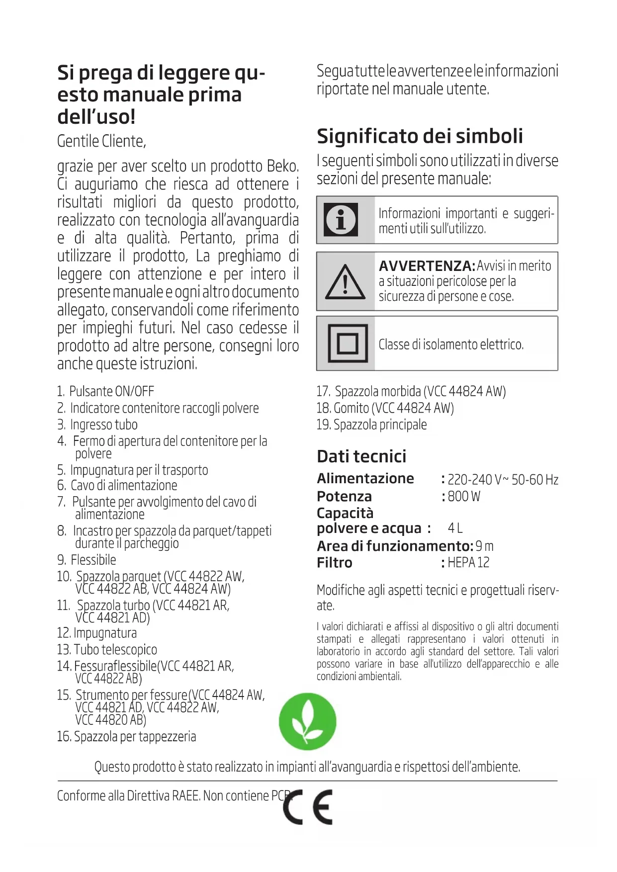 VCC 44822 AW - Aspirapolvere BEKO - Manuale utente e istruzioni gratuiti