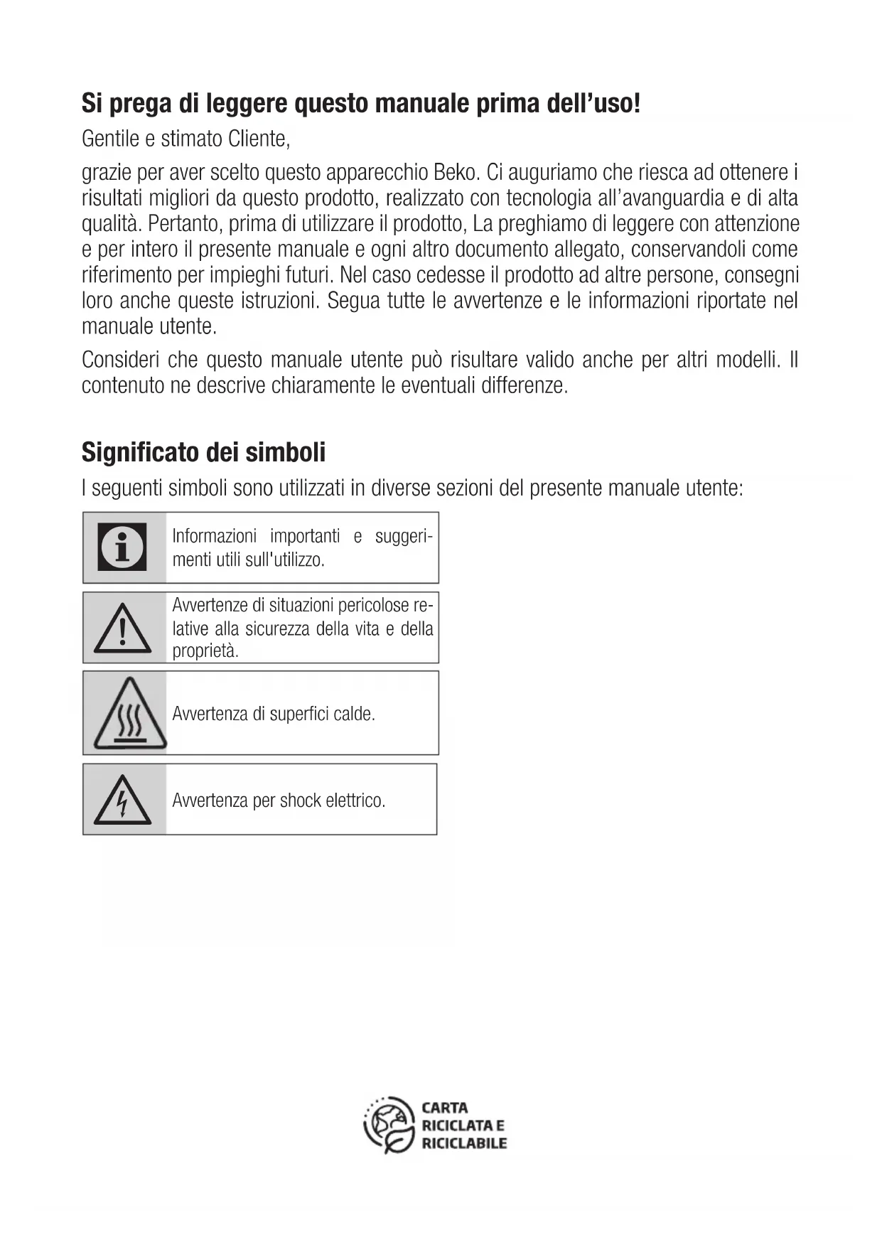 Diese Garantiezusage ist nur gültig innerhalb der Bundesrepublik Deutschland Garantiebedingungen - Beko – Version Februar 2021Si prega di leggere questo manuale prima dell’uso! Gentile e stimato Cliente, grazie per aver scelto questo apparecchio Beko. Ci auguriamo che riesca ad ottenere i risultati migliori da questo prodotto, realizzato con tecnologia all’avanguardia e di alta qualità. Pertanto, prima di utilizzare il prodotto, La preghiamo di leggere con attenzione e per intero il presente manuale e ogni altro documento allegato, conservandoli come riferimento per impieghi futuri. Nel caso cedesse il prodotto ad altre persone, consegni loro anche queste istruzioni. Segua tutte le avvertenze e le informazioni riportate nel manuale utente. Consideri che questo manuale utente può risultare valido anche per altri modelli. Il contenuto ne descrive chiaramente le eventuali differenze. Significato dei simboli I seguenti simboli sono utilizzati in diverse sezioni del presente manuale utente: