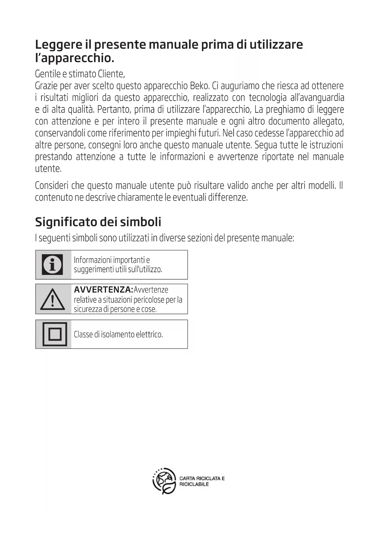 - Durante la movimentazione e il trasporto dell’apparecchio, riporre l’apparecchio all’interno del suo imballaggio originale. L’imballaggio dell’apparecchio lo proteggerà contro eventuali danni materiali. • Non posizionare carichi pesanti sull’apparecchio o il suo imballaggio. L’apparecchio potrebbe danneggiarsi. • Un’eventuale caduta dell’apparecchio potrebbe inficiarne il funzionamento o provocare danni permanenti. 4 Pulizia e manutenzioneCERTIFICATO DI GARANZIA La presente garanzia convenzionale descrive le condizioni di garanzia offerte da BEKO Italy S.r.l.(“Beko") con riferimento ai propri prodotti. La presente garanzia convenzionale si intende come aggiuntiva e non sostitutiva della garanzia legale, di cui è responsabile il venditore, e non pregiudica qualsiasi altro diritto di cui gode il consumatore ai sensi del D.lgs. 206/05 (“Codice del Consumo”). Per consumatore si intende esclusivamente colui che utilizza il prodotto per scopi estranei all’attività imprenditoriale o professionale eventualmente svolta e che quindi ne fa un uso domestico/privato Questo certificato non deve essere spedito per la convalida. È valido e operante solo se conservato assieme allo scontrino fiscale o altro documento di acquisto fiscalmente obbligatorio. Condizioni di Garanzia