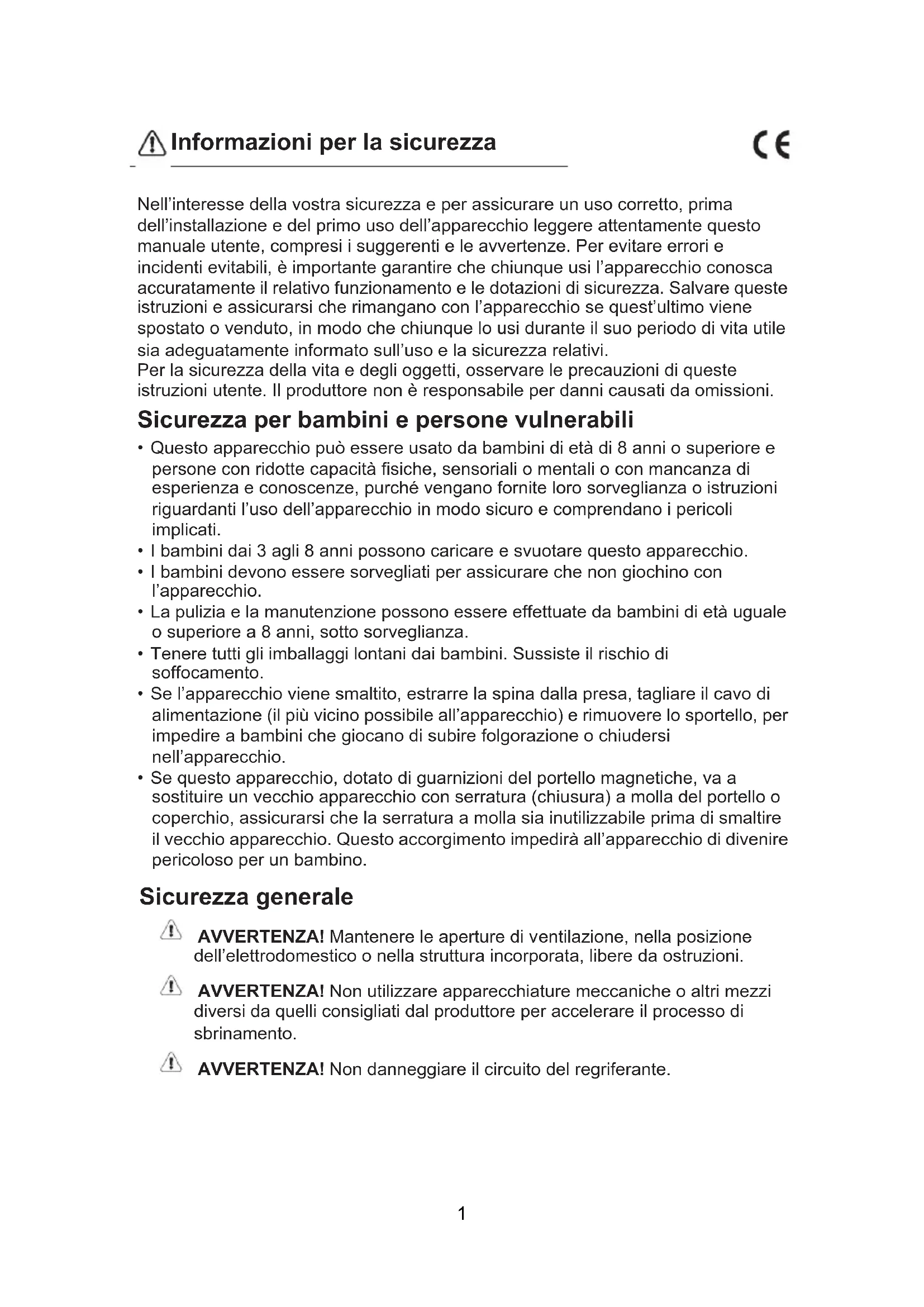 - Se questo apparecchio, dotato di guarnizioni del portello magnetiche, va a sostituire un vecchio apparecchio con serratura (chiusura) a molla del portello o coperchio, assicurarsi che la serratura a molla sia inutilizzabile prima di smaltire il vecchio apparecchio. Questo accorgimento impedirà all’apparecchio di divenire pericoloso per un bambino. Sicurezza generale AVVERTENZA! Mantenere le aperture di ventilazione, nella posizione dell’elettrodomestico o nella struttura incorporata, libere da ostruzioni. AVVERTENZA! Non utilizzare apparecchiature meccaniche o altri mezzi diversi da quelli consigliati dal produttore per accelerare il processo di sbrinamento. AVVERTENZA! Non danneggiare il circuito del regriferante. 1Informazioni per la sicurezza