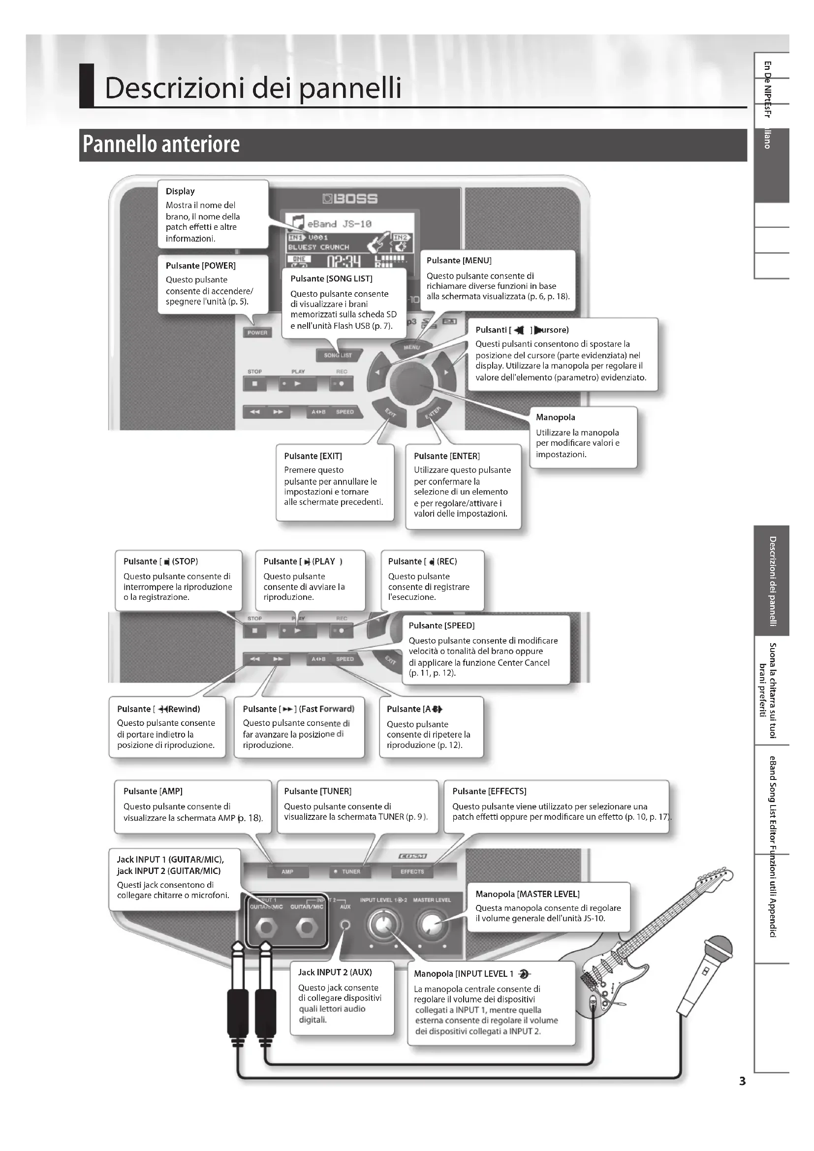 Descrizioni dei pannelli Pannello anteriore Pulsante [MENU] Questo pulsante consente di richiamare diverse funzioni in base alla schermata visualizzata (p. 6, p. 18). Manopola Utilizzare la manopola per modicare valori e impostazioni. Pulsante [EXIT] Premere questo pulsante per annullare le impostazioni e tornare alle schermate precedenti. Pulsante [ENTER] Utilizzare questo pulsante per confermare la selezione di un elemento e per regolare/attivare i valori delle impostazioni. Pulsante [POWER] Questo pulsante consente di accendere/ spegnere l'unità (p. 5). Pulsanti [ ] [ ] (cursore) Questi pulsanti consentono di spostare la posizione del cursore (parte evidenziata) nel display. Utilizzare la manopola per regolare il valore dell'elemento (parametro) evidenziato. Display Mostra il nome del brano, il nome della patch eetti e altre informazioni. Pulsante [SONG LIST] Questo pulsante consente di visualizzare i brani memorizzati sulla scheda SD e nell'unità Flash USB (p. 7). Pulsante [ ] (Rewind) Questo pulsante consente di portare indietro la posizione di riproduzione. Pulsante [ ] (Fast Forward) Questo pulsante consente di far avanzare la posizione di riproduzione. Pulsante [A B] Questo pulsante consente di ripetere la riproduzione (p. 12). Pulsante [ ] (STOP) Questo pulsante consente di interrompere la riproduzione o la registrazione. Pulsante [ ] (PLAY) Questo pulsante consente di avviare la riproduzione. Pulsante [ ] (REC) Questo pulsante consente di registrare l'esecuzione. Pulsante [SPEED] Questo pulsante consente di modicare velocità o tonalità del brano oppure di applicare la funzione Center Cancel (p. 11, p. 12). Manopola [MASTER LEVEL] Questa manopola consente di regolare il volume generale dell'unità JS-10. Jack INPUT 2 (AUX) Questo jack consente di collegare dispositivi quali lettori audio digitali. Manopola [INPUT LEVEL 1 2] La manopola centrale consente di regolare il volume dei dispositivi collegati a INPUT 1, mentre quella esterna consente di regolare il volume dei dispositivi collegati a INPUT 2. Pulsante [AMP] Questo pulsante consente di visualizzare la schermata AMP ( p. 18). Pulsante [TUNER] Questo pulsante consente di visualizzare la schermata TUNER (p. 9). Pulsante [EFFECTS] Questo pulsante viene utilizzato per selezionare una patch eetti oppure per modicare un eetto (p. 10, p. 17). Jack INPUT 1 (GUITAR/MIC), jack INPUT 2 (GUITAR/MIC) Questi jack consentono di collegare chitarre o microfoni.4 Descrizioni dei pannelli Pannello superiore/Pannelli laterali Alloggiamento per scheda SD Consente di inserire la scheda SD. Jack EXP PEDAL/CTL 1, 2 Consente di collegare un interruttore a pedale (acquistabile separatamente) o un pedale di espressione (acquistabile separatamente) (p. 30). Fessura di sicurezza ( ) http://www.kensington.com/ Jack PHONES Consente di collegare le cue (acquistabili separatamente). Jack LINE OUT Consente di collegare gli altoparlanti esterni. Porta USB COMPUTER Consente di collegare l'unità JS-10 a un PC utilizzando un cavo USB (p. 13, p. 27). Porta USB MEMORY Consente di collegare un'unità Flash USB (acquistabile separatamente). Supporti per coperchi USB Collocare qui i coperchi rimossi dalla porta USB MEMORY o dalla porta USB COMPUTER. Jack DC IN Consente di collegare l'adattatore CA in dotazione. Alla presa di corrente Indicatore Adattatore CA Cavo di alimentazione