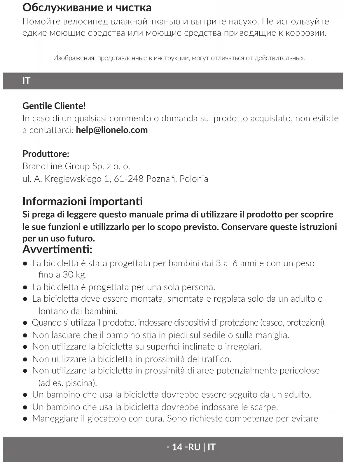 - Maneggiare il giocaolo con cura. Sono richieste competenze per evitare Обслуживание и чистка Помойте велосипед влажной тканью и вытрите насухо. Не используйте едкие моющие средства или моющие средства приводящие к коррозии. Изображения, представленные в инструкции, могут отличаться от действительных.‑ 15 ‑ IT cadute o collisioni che causano lesioni all’utente o ad altri.