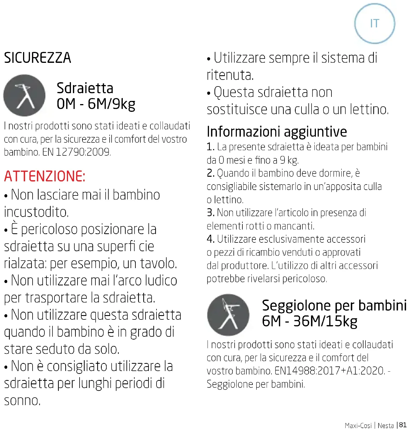 SICUREZZA Sdraietta 0M - 6M/9kg I nostri prodotti sono stati ideati e collaudati con cura, per la sicurezza e il comfort del vostro bambino. EN 12790:2009. ATTENZIONE: