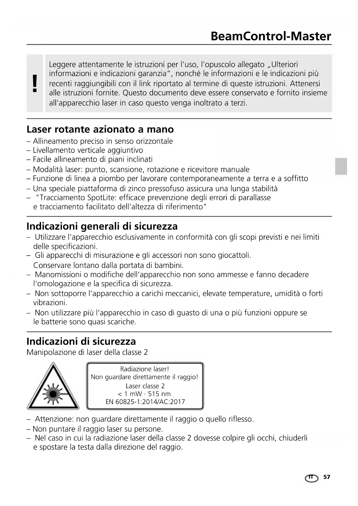 Indicazioni generali di sicurezza – Utilizzare l‘apparecchio esclusivamente in conformità con gli scopi previsti e nei limiti delle specicazioni. – Gli apparecchi di misurazione e gli accessori non sono giocattoli. Conservare lontano dalla portata di bambini. – Manomissioni o modiche dell‘apparecchio non sono ammesse e fanno decadere l‘omologazione e la specica di sicurezza. – Non sottoporre l‘apparecchio a carichi meccanici, elevate temperature, umidità o forti vibrazioni. – Non utilizzare più l‘apparecchio in caso di guasto di una o più funzioni oppure se le batterie sono quasi scariche. Indicazioni di sicurezza Manipolazione di laser della classe 2 Radiazione laser! Non guardare direttamente il raggio! Laser classe 2 < 1 mW · 515 nm EN 60825-1:2014/AC:2017 – Attenzione: non guardare direttamente il raggio o quello riesso. – Non puntare il raggio laser su persone. – Nel caso in cui la radiazione laser della classe 2 dovesse colpire gli occhi, chiuderli e spostare la testa dalla direzione del raggio. IT58