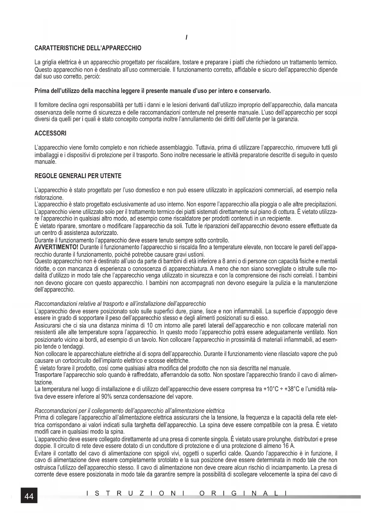La griglia elettrica è un apparecchio progettato per riscaldare, tostare e preparare i piatti che richiedono un trattamento termico. Questo apparecchio non è destinato all’uso commerciale. Il funzionamento corretto, affi dabile e sicuro dell’apparecchio dipende dal suo uso corretto, perciò: Prima dell’utilizzo della macchina leggere il presente manuale d’uso per intero e conservarlo. Il fornitore declina ogni responsabilità per tutti i danni e le lesioni derivanti dall’utilizzo improprio dell’apparecchio, dalla mancata osservanza delle norme di sicurezza e delle raccomandazioni contenute nel presente manuale. L’uso dell’apparecchio per scopi diversi da quelli per i quali è stato concepito comporta inoltre l’annullamento dei diritti dell’utente per la garanzia. ACCESSORI L’apparecchio viene fornito completo e non richiede assemblaggio. Tuttavia, prima di utilizzare l’apparecchio, rimuovere tutti gli imballaggi e i dispositivi di protezione per il trasporto. Sono inoltre necessarie le attività preparatorie descritte di seguito in questo manuale.