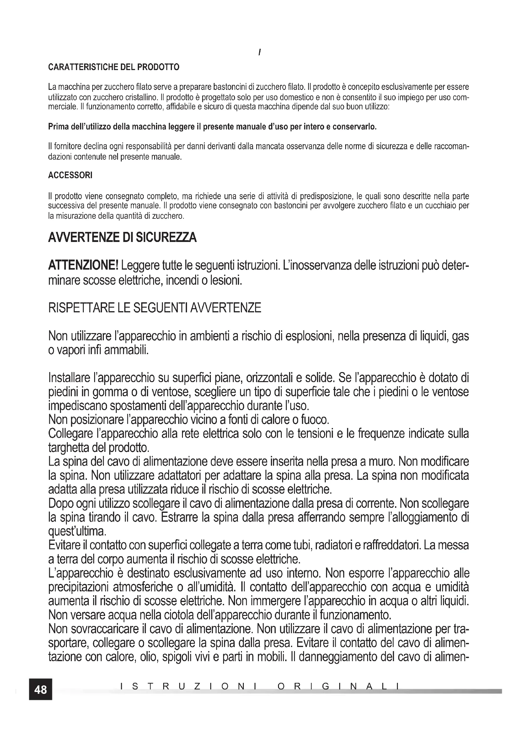 La macchina per zucchero fi lato serve a preparare bastoncini di zucchero fi lato. Il prodotto è concepito esclusivamente per essere utilizzato con zucchero cristallino. Il prodotto è progettato solo per uso domestico e non è consentito il suo impiego per uso com- merciale. Il funzionamento corretto, affi dabile e sicuro di questa macchina dipende dal suo buon utilizzo: Prima dell’utilizzo della macchina leggere il presente manuale d’uso per intero e conservarlo. Il fornitore declina ogni responsabilità per danni derivanti dalla mancata osservanza delle norme di sicurezza e delle raccoman- dazioni contenute nel presente manuale. ACCESSORI Il prodotto viene consegnato completo, ma richiede una serie di attività di predisposizione, le quali sono descritte nella parte successiva del presente manuale. Il prodotto viene consegnato con bastoncini per avvolgere zucchero fi lato e un cucchiaio per la misurazione della quantità di zucchero.