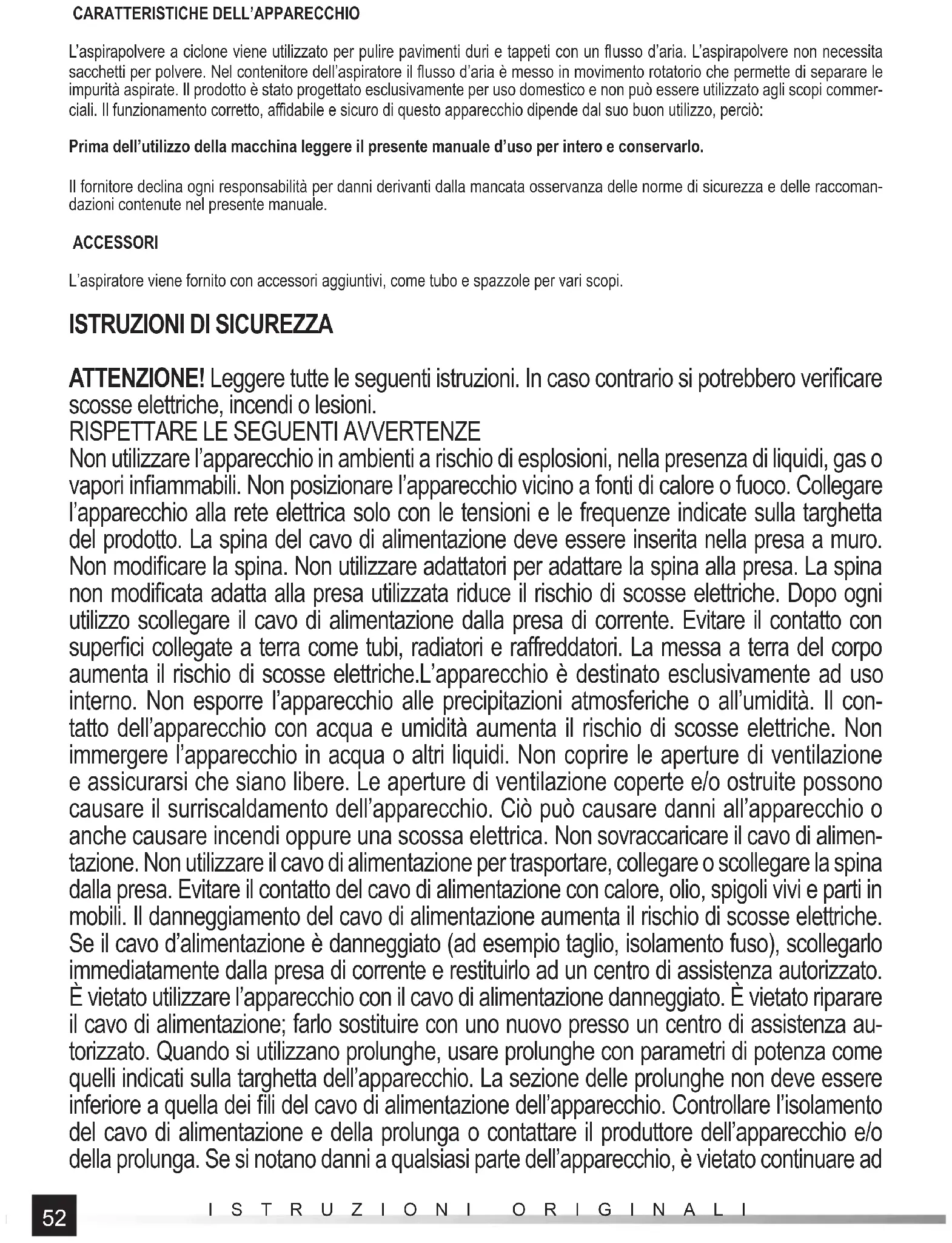 ISTRUZIONI ORIGINALI utilizzarlo. In questo caso, l’apparecchio deve essere portato presso un centro di assistenza autorizzato o sostituito dall’utente stesso, se il manuale dell’utente autorizza tali azioni di riparazione. Spegnere l’apparecchio e scollegare il cavo di alimentazione dalla presa a muro prima di iniziare qualsiasi operazione di sostituzione delle parti, pulizia o regolazione. Prima di sostituire gli accessori, spegnere l’apparecchio e scollegare il cavo di alimentazione dalla presa a muro. L’apparecchio può essere utilizzato da bambini di età superiore a 8 anni e dalle persone di ridotte capacità fi siche, mentali e che non hanno familiarità con il prodotto, se sono sotto supervisione per garantire che il prodotto sia utilizzato in modo sicuro e con la comprensione dei rischi correlati. I bambini non devono giocare con questo apparecchio. I bambini non accompagnati non devono eseguire la pulizia e la manutenzione dell’apparec- chio.L’apparecchio è destinato esclusivamente ad uso domestico. Non aspirare persone e animali, non avvicinare l’ingresso degli ugelli di aspirazione agli occhi e alle orecchie. Non passare con l’aspirapolvere sul cavo di alimentazione, non sostare sul cavo di alimentazione. Ciò può danneggiare il cavo e causare una scossa elettrica.Prima di ogni utilizzo verifi care le condizioni dei fi ltri dell’aspiratore. È vietato utilizzare l’aspiratore senza fi ltri o con fi ltri danneggiati. Prima di ogni utilizzo controllare la permeabilità del tubo fl essibile, dei tubi e delle bocchette di aspirazione. Se durante il funzionamento si osserva una diminuzione della potenza di aspirazione, è necessario verifi care la permeabilità degli elementi di cui sopra e il livello di riempimento del contenitore raccogli polvere.Non aspirare mozziconi di sigaretta, fi ammiferi, ceneri calde. Evitare di aspirare oggetti appuntiti, ad es. aghi, chiodi, chiodi, spilli o punti metallici. Non aspirare acqua o altri liquidi. Non aspirare rifi uti umidi. Non aspirare la polvere fi ne, ad es. farina, gesso, toner per stampanti ecc. Non utilizzare l’aspirapolvere per la pulizia di rifi uti industriali, ad es. segatura, detriti, trucioli metallici, trucioli metallici ecc.L’a- spiratore non deve essere utilizzato in un impianto di aspirazione della polvere generata da altri utensili, ad es. rettifi ca, taglio, lucidatura ecc. Durante l’aspirazione può manifestarsi una leggera elettrifi cazione dell’apparecchio. Ciò è normale, specialmente quando si pulisce in condizioni di bassa umidità. Per ridurre al minimo questo fenomeno, è necessario toccare periodicamente con il tubo in metallo oggetti collegati a terra in casa, ad es. radiatori, e au- mentare l’umidità dell’ambiente da pulire.