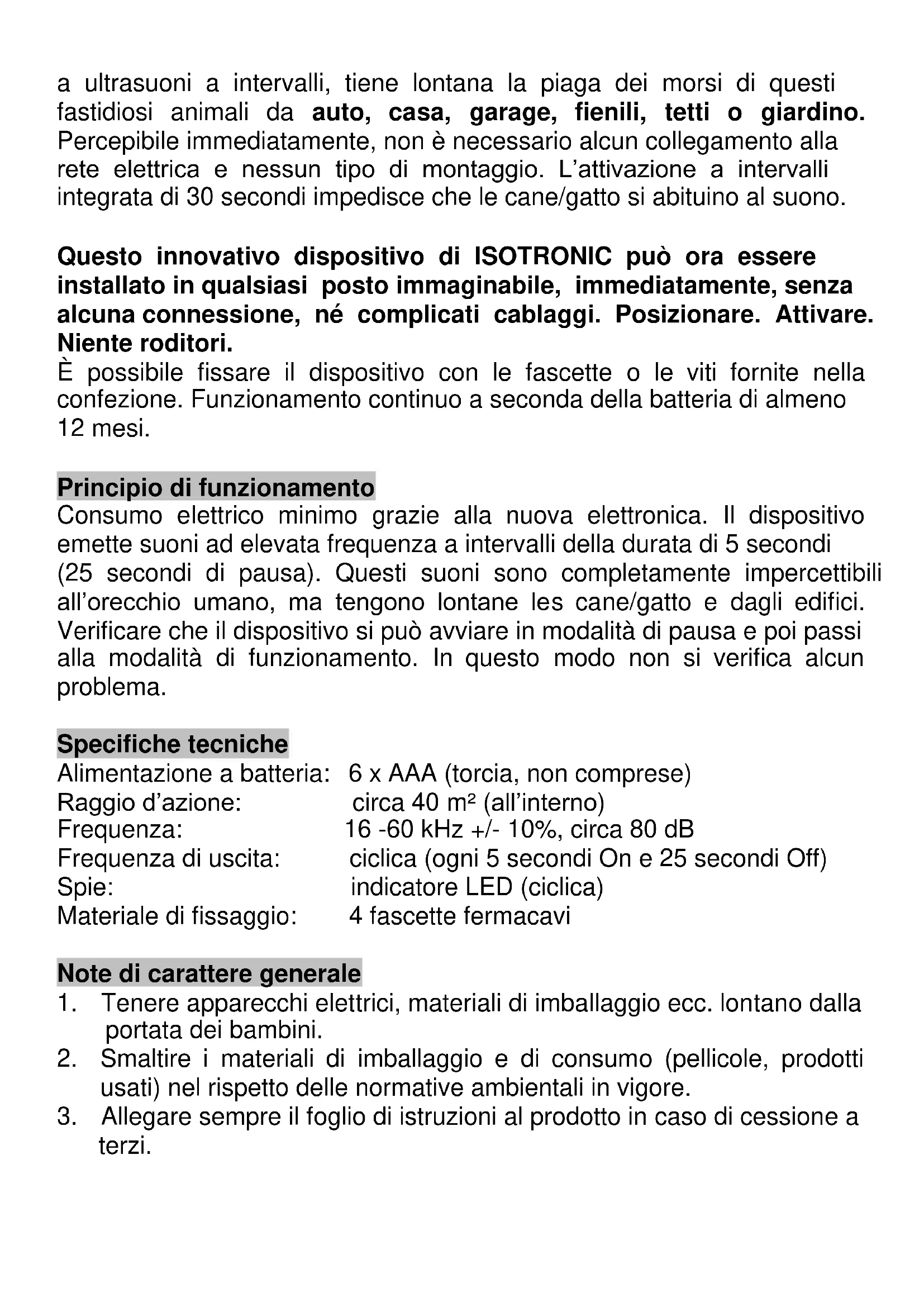 Gentile cliente, La ringraziamo per aver acquistato un prodotto Isotronic. Prima delll΄uso, legga attentamente le istruzioni e le custodisca, per eventuali tuture necessità. Descrizione del prodotto L’innovativo anti- cane/gatto mobile di ISOTRONIC. Alimentazione a batterie, mobile ed altamente efficace. Non sarà più necessario in futuro alterarsi per le indesiderate visite di cane/gatto nei propri spazi. ISOTRONIC Anti-Cane/Gatto Mobile, graziea ultrasuoni a intervalli, tiene lontana la piaga dei morsi di questi fastidiosi animali da auto, casa, garage, fienili, tetti o giardino. Percepibile immediatamente, non è necessario alcun collegamento alla rete elettrica e nessun tipo di montaggio. L’attivazione a intervalli integrata di 30 secondi impedisce che le cane/gatto si abituino al suono. Questo innovativo dispositivo di ISOTRONIC può ora essere installato in qualsiasi posto immaginabile, immediatamente, senza alcuna connessione, né complicati cablaggi. Posizionare. Attivare. Niente roditori. È possibile fissare il dispositivo con le fascette o le viti fornite nella confezione. Funzionamento continuo a seconda della batteria di almeno 12 mesi. Principio di funzionamento Consumo elettrico minimo grazie alla nuova elettronica. Il dispositivo emette suoni ad elevata frequenza a intervalli della durata di 5 secondi (25 secondi di pausa). Questi suoni sono completamente impercettibili all’orecchio umano, ma tengono lontane les cane/gatto e dagli edifici. Verificare che il dispositivo si può avviare in modalità di pausa e poi passi alla modalità di funzionamento. In questo modo non si verifica alcun problema. Specifiche tecniche Alimentazione a batteria: 6 x AAA (torcia, non comprese) Raggio d’azione: circa 40 m² (all’interno) Frequenza: 16 -60 kHz +/- 10%, circa 80 dB Frequenza di uscita: ciclica (ogni 5 secondi On e 25 secondi Off) Spie: indicatore LED (ciclica) Materiale di fissaggio: 4 fascette fermacavi Note di carattere generale