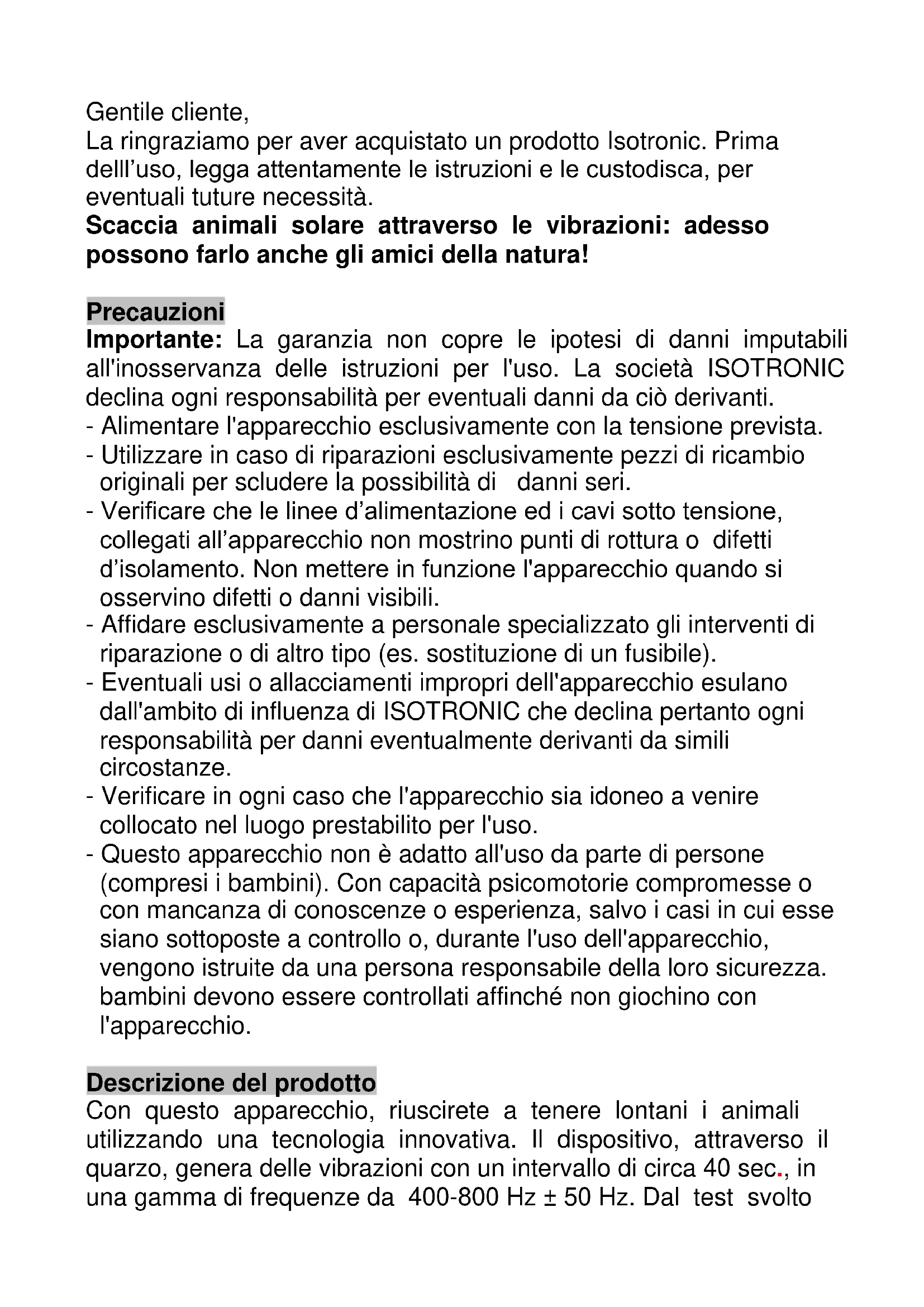 Istruzioni per l’uso Scaccia animali solare Perfetto impianto elettronico collegato alla tecnologia solare, lavorazione di alta qualità: la maniera più rispettosa dell'ambiente per scacciare i talpe e formiche. Articolo 70010Gentile cliente, La ringraziamo per aver acquistato un prodotto Isotronic. Prima delll’uso, legga attentamente le istruzioni e le custodisca, per eventuali tuture necessità. Scaccia animali solare attraverso le vibrazioni: adesso possono farlo anche gli amici della natura! Precauzioni Importante: La garanzia non copre le ipotesi di danni imputabili all'inosservanza delle istruzioni per l'uso. La società ISOTRONIC declina ogni responsabilità per eventuali danni da ciò derivanti. - Alimentare l'apparecchio esclusivamente con la tensione prevista. - Utilizzare in caso di riparazioni esclusivamente pezzi di ricambio originali per scludere la possibilità di danni seri. - Verificare che le linee d’alimentazione ed i cavi sotto tensione, collegati all’apparecchio non mostrino punti di rottura o difetti d’isolamento. Non mettere in funzione l'apparecchio quando si osservino difetti o danni visibili. - Affidare esclusivamente a personale specializzato gli interventi di riparazione o di altro tipo (es. sostituzione di un fusibile). - Eventuali usi o allacciamenti impropri dell'apparecchio esulano dall'ambito di influenza di ISOTRONIC che declina pertanto ogni responsabilità per danni eventualmente derivanti da simili circostanze. - Verificare in ogni caso che l'apparecchio sia idoneo a venire collocato nel luogo prestabilito per l'uso. - Questo apparecchio non è adatto all'uso da parte di persone (compresi i bambini). Con capacità psicomotorie compromesse o con mancanza di conoscenze o esperienza, salvo i casi in cui esse siano sottoposte a controllo o, durante l'uso dell'apparecchio, vengono istruite da una persona responsabile della loro sicurezza. bambini devono essere controllati affinché non giochino con l'apparecchio. Descrizione del prodotto Con questo apparecchio, riuscirete a tenere lontani i animali utilizzando una tecnologia innovativa. Il dispositivo, attraverso il quarzo, genera delle vibrazioni con un intervallo di circa 40 sec., in una gamma di frequenze da 400-800 Hz ± 50 Hz. Dal test svoltoall'aperto è risultato che le vibrazioni generate in tal modo avevano un ottimo effetto nel raggio di circa 700 m². Questo raggio può variare a seconda della composizione del terreno. Le frequenze acustiche e le vibrazioni sono insopportabili per molti animali di terra, per questo migrano verso altre zone già dopo pochi giorni. I luoghi ideali per l'utilizzo di un dispositivo a energia solare contro i roditori sono i giardini, i terreni coltivati e altre zone all'aperto in cui si presentano dei roditori indesiderati. Il preciso impianto elettronico e gli efficienti moduli solari garantiscono un funzionamento regolare anche in caso di condizioni di luce non ideali. Questo apparecchio tiene lontani non soltanto i talpe e formiche. Installazione e manutenzione