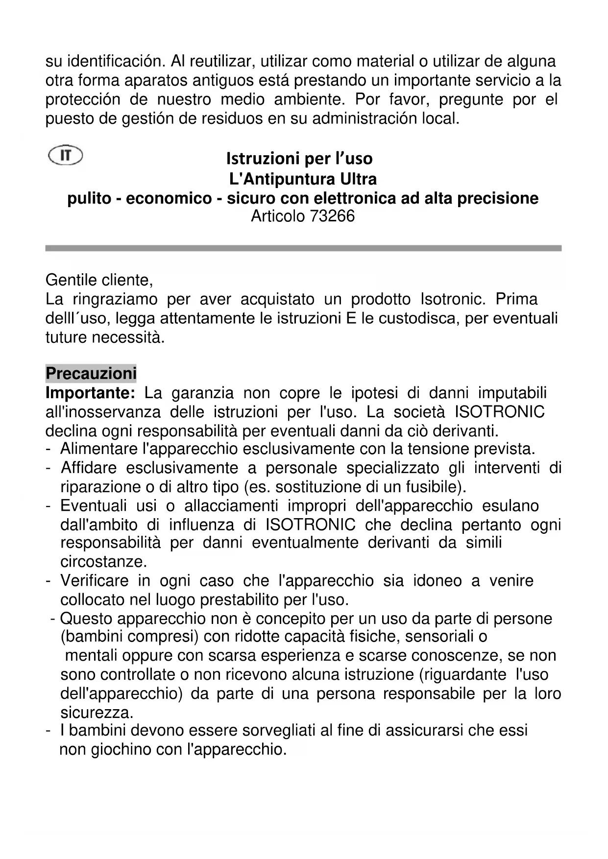 Gentile cliente, La ringraziamo per aver acquistato un prodotto Isotronic. Prima delll΄uso, legga attentamente le istruzioni E le custodisca, per eventuali tuture necessità. Precauzioni Importante: La garanzia non copre le ipotesi di danni imputabili all'inosservanza delle istruzioni per l'uso. La società ISOTRONIC declina ogni responsabilità per eventuali danni da ciò derivanti. - Alimentare l'apparecchio esclusivamente con la tensione prevista. - Affidare esclusivamente a personale specializzato gli interventi di riparazione o di altro tipo (es. sostituzione di un fusibile). - Eventuali usi o allacciamenti impropri dell'apparecchio esulano dall'ambito di influenza di ISOTRONIC che declina pertanto ogni responsabilità per danni eventualmente derivanti da simili circostanze. - Verificare in ogni caso che l'apparecchio sia idoneo a venire collocato nel luogo prestabilito per l'uso. - Questo apparecchio non è concepito per un uso da parte di persone (bambini compresi) con ridotte capacità fisiche, sensoriali o mentali oppure con scarsa esperienza e scarse conoscenze, se non sono controllate o non ricevono alcuna istruzione (riguardante l'uso dell'apparecchio) da parte di una persona responsabile per la loro sicurezza. - I bambini devono essere sorvegliati al fine di assicurarsi che essi non giochino con l'apparecchio.1. Descrizione del prodotto Questo dispositivo d'avanguardia evita le punture di insetti tramite una presa senza l'ausilio di sostanze chimiche. Basta inserirlo nella presa e l'Antipuntura Ultra è pronto all'uso in cucina, cameretta, sala da pranzo, camera da letto ecc... È scientificamente dimostrato che solo gli insetti di sesso femminile fecondati pungono l'uomo poiché necessitano di sangue per nutrire le loro uova. Questo comportamento fu dimostrato con successo dal Professore Dott. W. Frank, una volta Responsabile del Dipartimento di Parassitologia dell'Università di Hohenheim. Su richiesta, riceverete la perizia scientifica da noi redatta. L'Antipuntura Ultra è indispensabile per tutti coloro che vogliono proteggersi dalle punture degli insetti.