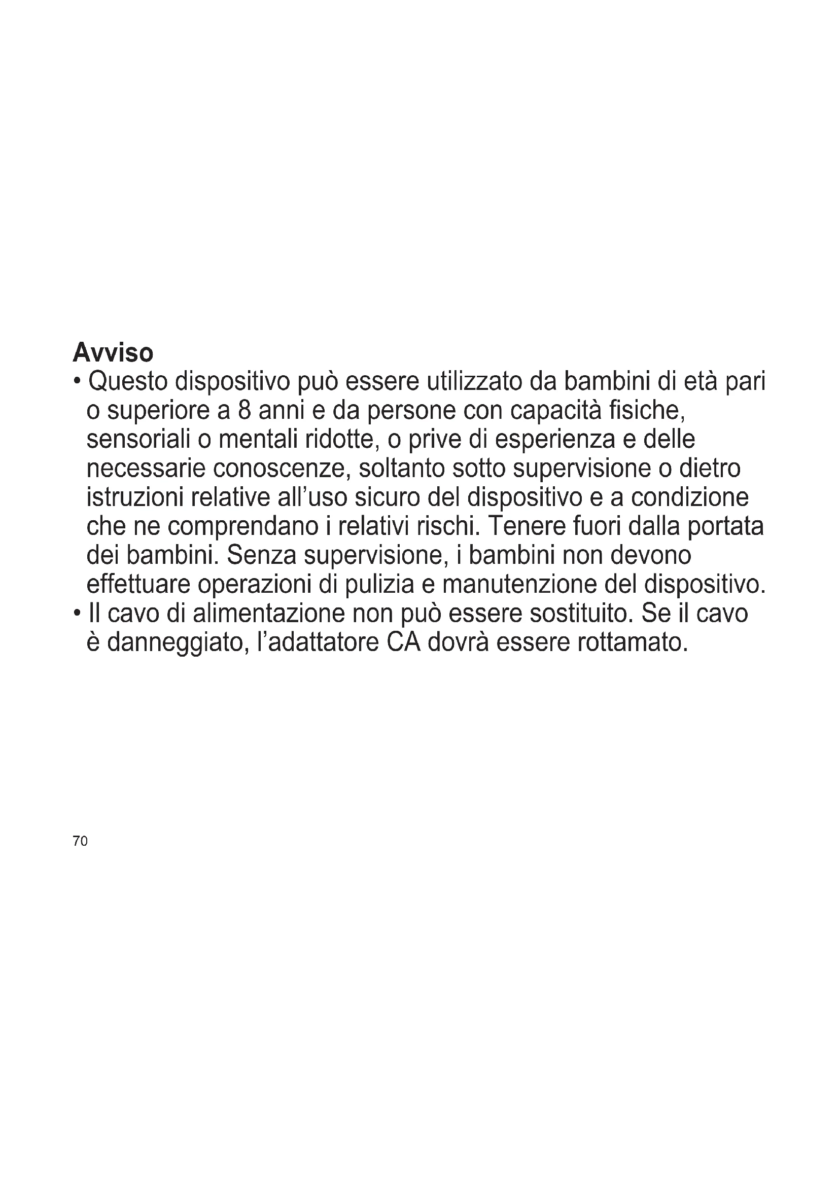 - Questo dispositivo può essere utilizzato da bambini di età pari o superiore a 8 anni e da persone con capacità siche, sensoriali o mentali ridotte, o prive di esperienza e delle necessarie conoscenze, soltanto sotto supervisione o dietro istruzioni relative all’uso sicuro del dispositivo e a condizione che ne comprendano i relativi rischi. Tenere fuori dalla portata dei bambini. Senza supervisione, i bambini non devono effettuare operazioni di pulizia e manutenzione del dispositivo.
