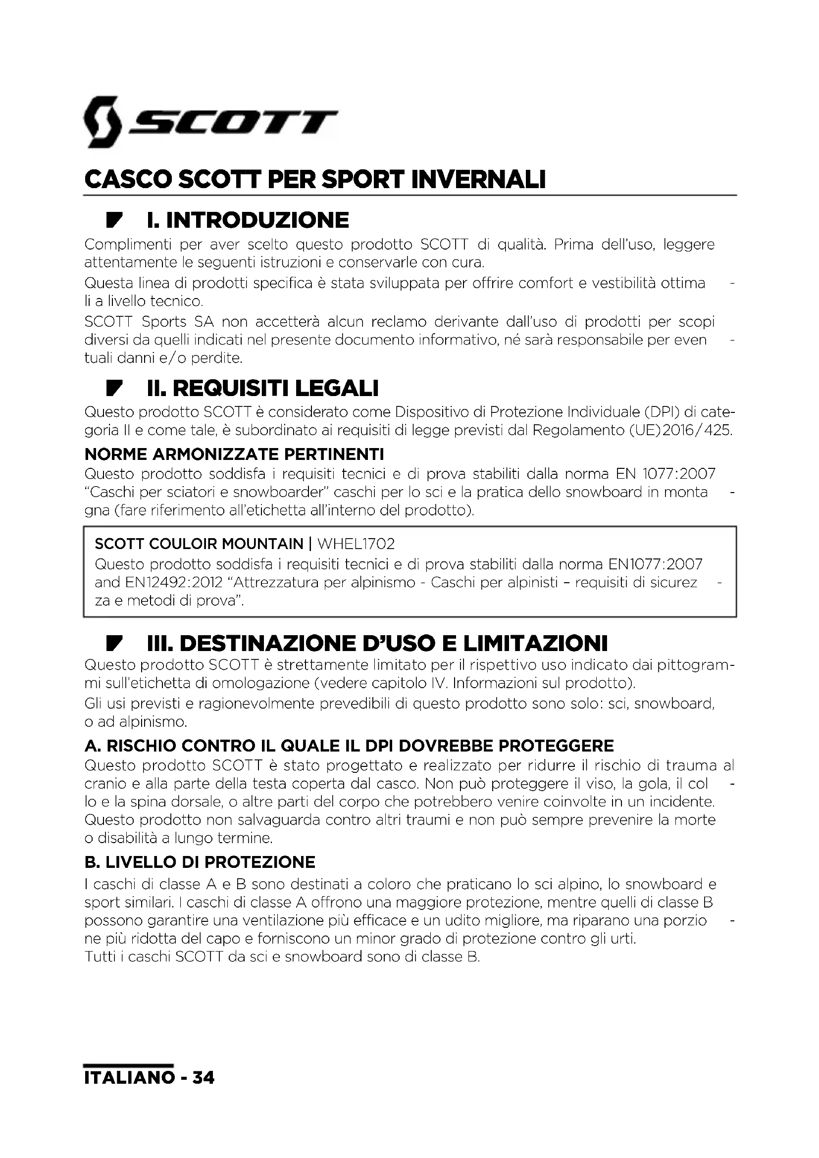 - III. DESTINAZIONE D’USO E LIMITAZIONI Questo prodotto SCOTT è strettamente limitato per il rispettivo uso indicato dai pittogram- mi sull’etichetta di omologazione (vedere capitolo IV. Informazioni sul prodotto). Gli usi previsti e ragionevolmente prevedibili di questo prodotto sono solo : sci, snowboard, o ad alpinismo. A. RISCHIO CONTRO IL QUALE IL DPI DOVREBBE PROTEGGERE Questo prodotto SCOTT è stato progettato e realizzato per ridurre il rischio di trauma al cranio e alla parte della testa coperta dal casco. Non può proteggere il viso, la gola, il col
