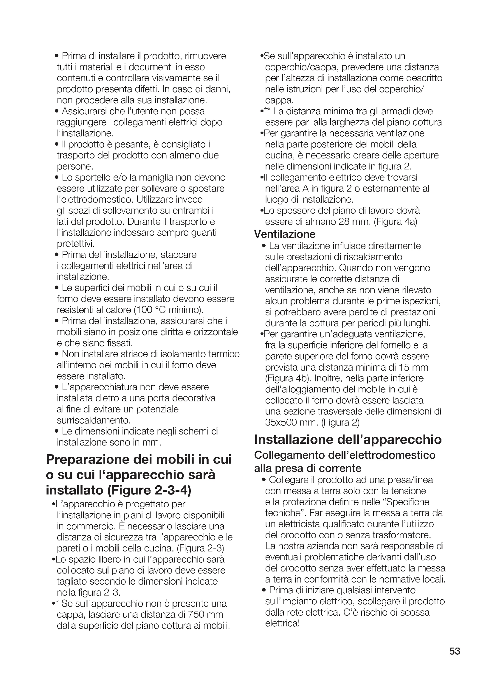 - Per garantire un’adeguata ventilazione, fra la superficie inferiore del fornello e la parete superiore del forno dovrà essere prevista una distanza minima di 15 mm (Figura 4b). Inoltre, nella parte inferiore dell’alloggiamento del mobile in cui è collocato il forno dovrà essere lasciata una sezione trasversale delle dimensioni di 35x500 mm. (Figura 2) Installazione dell’apparecchio Collegamento dell’elettrodomestico alla presa di corrente
