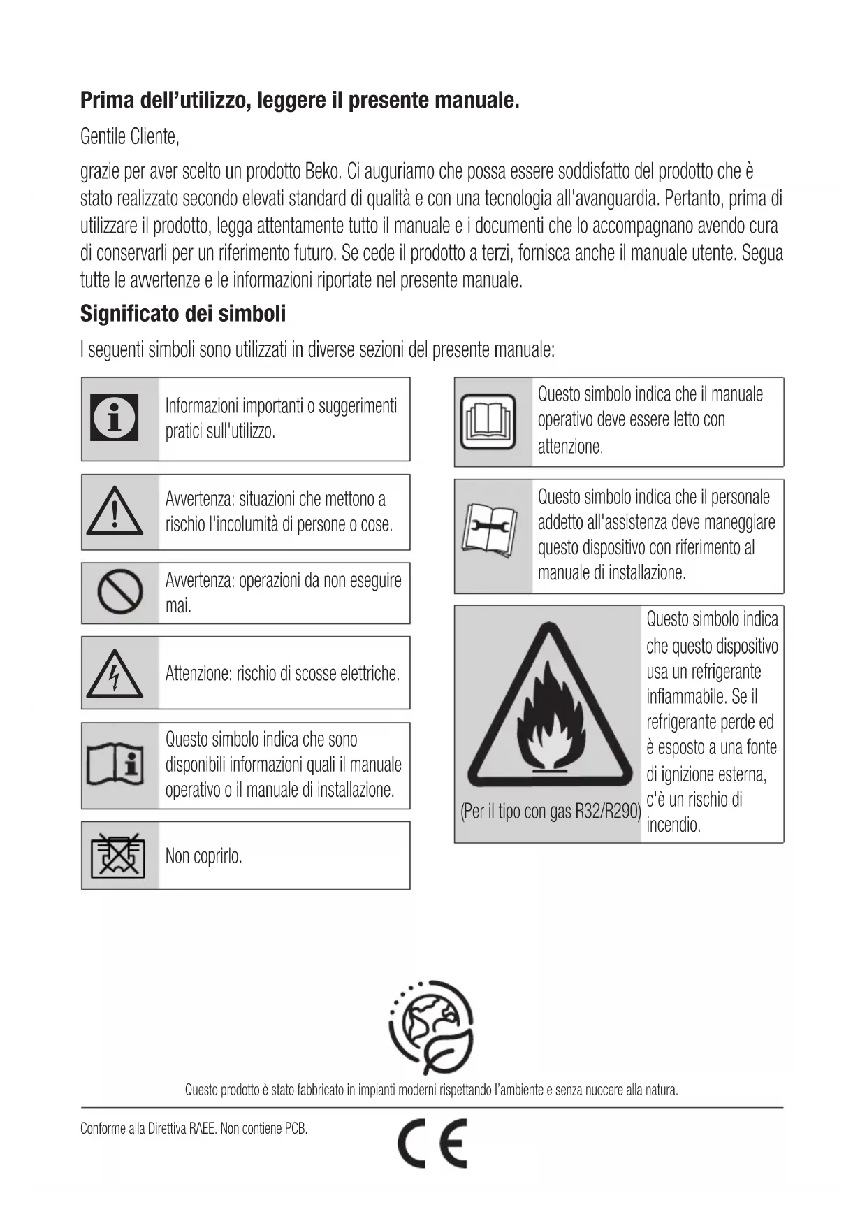 data. Please read nameplate on the air-conditioner. Please refer to detail product information required in Regulation No 206/2012 from leaflet of Product Fiche. 13 SpecificationsPrima dell’utilizzo, leggere il presente manuale. Gentile Cliente, grazie per aver scelto un prodotto Beko. Ci auguriamo che possa essere soddisfatto del prodotto che è stato realizzato secondo elevati standard di qualità e con una tecnologia all'avanguardia. Pertanto, prima di utilizzare il prodotto, legga attentamente tutto il manuale e i documenti che lo accompagnano avendo cura di conservarli per un riferimento futuro. Se cede il prodotto a terzi, fornisca anche il manuale utente. Segua tutte le avvertenze e le informazioni riportate nel presente manuale. Significato dei simboli I seguenti simboli sono utilizzati in diverse sezioni del presente manuale: Questo prodotto è stato fabbricato in impianti moderni rispettando l’ambiente e senza nuocere alla natura. Conforme alla Direttiva RAEE. Non contiene PCB.