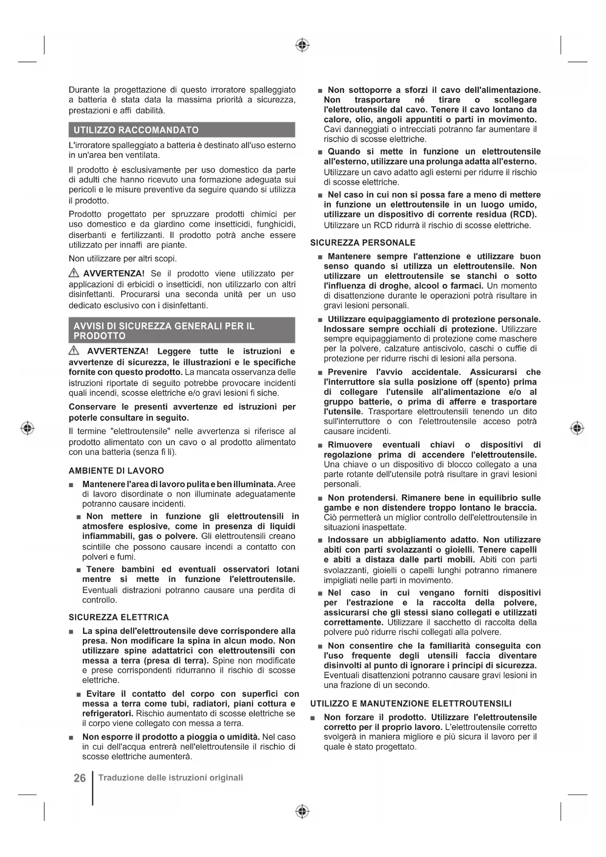 ■ Leggere attentamente le istruzioni. Familiarizzare con tutti i controlli e con l'utilizzo corretto del prodotto. ■ Non lasciare mai che bambini, persone con ridotte capacità fisiche, sensoriali o mentali o mancanza di esperienza e conoscenza o persone non familiari con queste istruzioni utilizzino il prodotto. ■ Il prodotto sarà utilizzato solo con prodotti per la protezione delle piante approvati dalle autorità locali/ nazionali per l'uso con gli spruzzatori a spalla. ■ Seguire le istruzioni del produttore chimico in merito all'attrezzatura protettiva. ■ Per ridurre il rischio di incidenti e danni al prodotto, non utilizzarlo mai con: ● liquidi infiammabili ● liquidi viscosi o appiccicosi ● sostanze chimiche caustiche o corrosive ● liquidi a temperatura superiore a 50 °C ■ Non spruzzare in presenza di scintille, fiamme o altre fonti di combustione. ■ Non mettere in funzione l'utensile in caso di paralame o schermi difettosi, oppure senza dispositivi di sicurezza correttamente montati. Non utilizzare mai un prodotto incompleto o modificato. L'uso di un prodotto difettoso, incompleto o modificato potrebbe causare situazioni pericolose. ■ Non spruzzare nella direzione di persone o animali. Evitare di utilizzare il dispositivo in caso di vento. I materiali da spruzzare potranno venire accidentalmente spruzzati su piante od oggetti sui quali non si intendeva spruzzare tali prodotti. Spruzzare sempre sottovento. ■ Spegnere immediatamente il prodotto e rimuovere il pacco batteria in caso di incidente o guasto. Non utilizzare di nuovo il prodotto finché non è stato controllato a fondo da un centro di assistenza autorizzato. ■ Se dall'ugello non fuoriesce nulla, il quantitativo del prodotto è diminuito o il tubo flessibile e il sistema dell'asta potrebbe essere bloccato. Sciacquare e pulire tutte le parti del tubo flessibile e del sistema dell'asta (pistola a spruzzo, filtro nel serbatoio, asta, tubo flessibile) con acqua pulita. Non soffiare mai con la bocca negli ugelli o in altri componenti.28 Traduzione delle istruzioni originali ■ Evitare il contatto con prodotti chimici per il controllo delle piante. Cambiarsi immediatamente gli abiti contaminati dai prodotti chimici per il controllo delle piante. Tenere i materiali da spruzzare lontano dagli occhi. Nel caso in cui i materiali da spruzzare entreranno in contatto con gli occhi, lavarsi immediatamente con acqua pulita. In caso di irritazioni, rivolgersi immediatamente a un medico. ■ Le sostanze da spruzzare con questo dispositivo possono essere pericolose se inalate, ingerite o se entrano in contatto con pelle e occhi. Indossare indumenti e attrezzature protettive quando: ● si riempie il serbatoio con materiali spray ● si spruzza ● si effettuano regolazioni ● si scarica e pulisce il serbatoio ● si cambiano i materiali spray ● si effettua la manutenzione del prodotto ■ Prima di utilizzare il prodotto, controllare sempre la presenza di perdite e ripararle. ■ Ispezionare attentamente il prodotto all'interno e all'esterno per esaminare i componenti prima di ciascun utilizzo. Individuare eventuali tubi rotti e deteriorati, che presentano perdite o blocchi e parti mancanti o danneggiate. In caso di danni, far riparare il prodotto prima dell'utilizzo. Una scarsa manutenzione del prodotto potrà causare molti incidenti. ■ Prestare attenzione ai pericoli presentati dalle soluzioni chimiche. Seguire sempre le istruzioni del produttore di prodotti chimici sull'uso, la gestione e la conservazione. ■ Non utilizzare il prodotto con il materiale di cui non si conosce il pericolo. ■ Assicurarsi che la bacchetta dello spruzzatore sia connessa con sicurezza al manico della bacchetta prima di utilizzare il prodotto. Se necessario, utilizzare delle pinze per collegare la bacchetta al manico dello spruzzatore. ■ Sostituire correttamente e stringere il coperchio del serbatoio dopo aver versato il liquido nel serbatoio. ■ Dopo un lungo tempo di conservazione o dopo l'inverno, spruzzare il prodotto con acqua pulita. Verificare la presenza di perdite o incrinature. ■ Seguire sempre le istruzioni della ditta produttrice riguardanti utilizzo, pulizia e riponimento stampate sull'involucro del prodotto. Riporre i prodotti chimici lontano dalla portata dei bambini. ■ Per ridurre il rischio di incendi o esplosioni, non utilizzare il prodotto con liquidi infiammabili, come la benzina o altri prodotti chimici con un punto di esplosione sotto i 55°C. ■ Azionare il prodotto solo con temperature tra 0°C e 40°C. ■ Conservare il prodotto in una posizione in cui la temperatura ambiente è compresa tra 0°C e 40°C. ■ Il prolungato utilizzo dell'utensile potrà causare o aggravare lesioni. Quando il prodotto viene utilizzato per periodi lunghi, assicurarsi di effettuare delle brevi interruzioni.