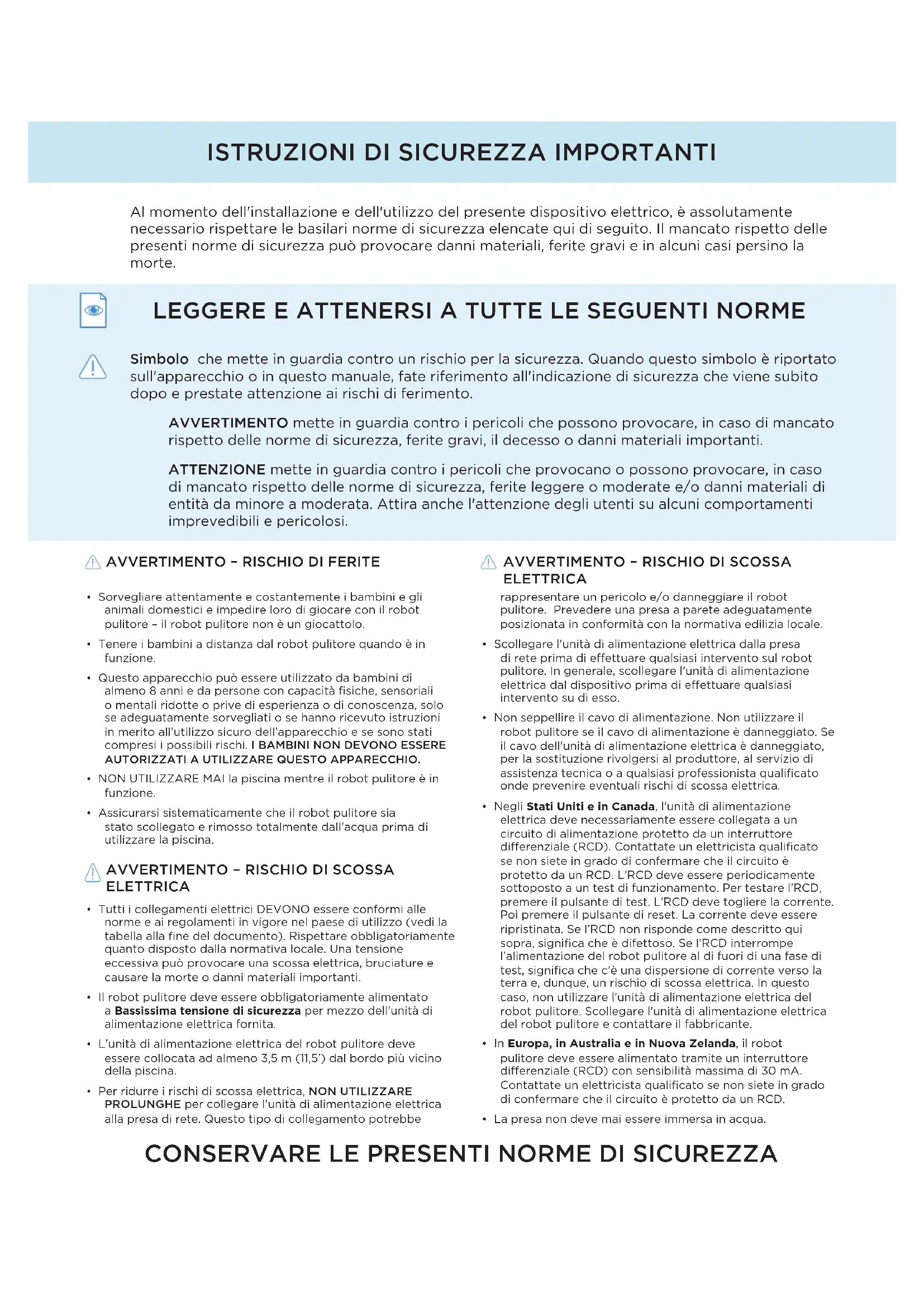 - Il robot pulitore deve essere obbligatoriamente alimentato a Bassissima tensione di sicurezza per mezzo dell'unità di alimentazione elettrica fornita.