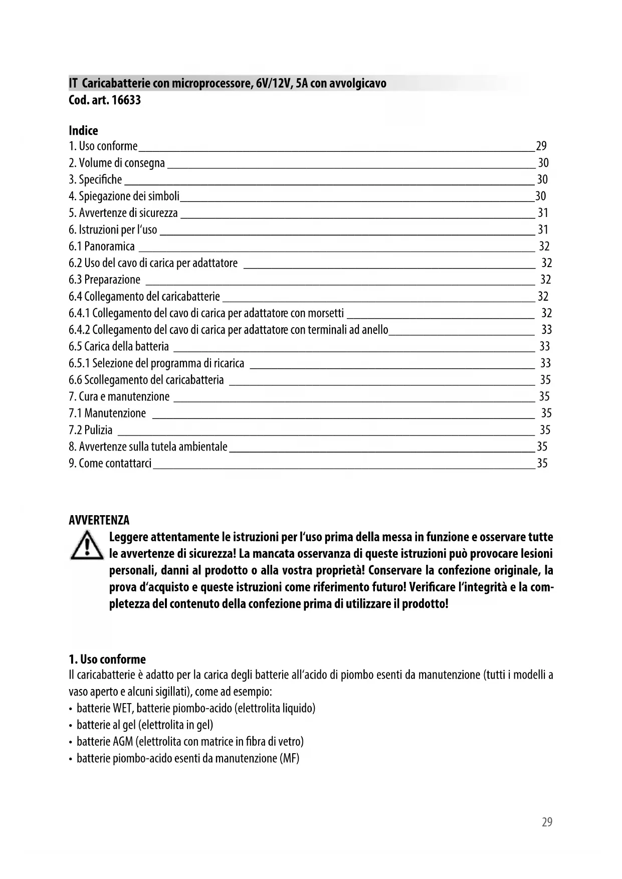 - 1x cavo di carica per adattatore con morsetti • 1x cavo di carica per adattatore con terminali ad anello Dimensioni: 180 x 80 x 45 [mm] Peso: 0,465 kg Lunghezza del cavo di alimentazione: 1,50 m Lunghezza del cavo di carica: 1,00 m + 0,50 m cavo di carica per adattatore Ingresso: 220-240 V AC 50/60 Hz Uscita: Modalità 6 V: 7,2 V DC 2,5 A Motocicletta: 14,3 V DC 2,5 A auto: 14,6 V DC 5,0 A Capacità della batteria: 6 V min 1,2 Ah max. 14 Ah 12 V min 1,2 Ah max. 150 Ah Classe di protezione: IP65 (solo l‘alloggiamento, non il cavo di collegamento e il cavo di carica) Temperatura ambiente: da -5 °C a +40 °C