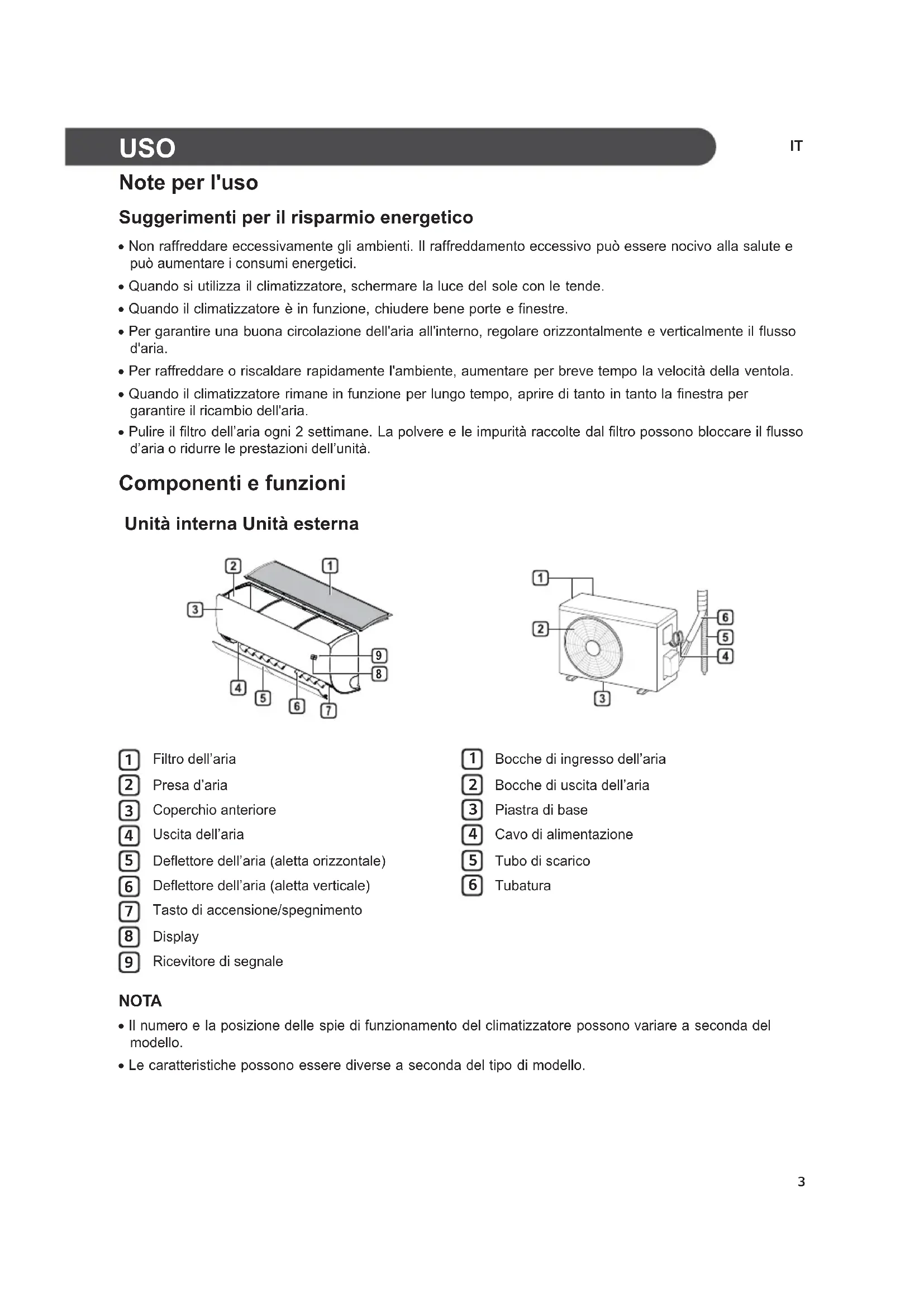 Note per l'uso Suggerimenti per il risparmio energetico x Non raffreddare eccessivamente gli ambienti. Il raffreddamento eccessivo può essere nocivo alla salute e può aumentare i consumi energetici. x Quando si utilizza il climatizzatore, schermare la luce del sole con le tende. x Quando il climatizzatore è in funzione, chiudere bene porte e finestre. x Per garantire una buona circolazione dell'aria all'interno, regolare orizzontalmente e verticalmente il flusso d'aria. x Per raffreddare o riscaldare rapidamente l'ambiente, aumentare per breve tempo la velocità della ventola. x Quando il climatizzatore rimane in funzione per lungo tempo, aprire di tanto in tanto la finestra per garantire il ricambio dell'aria. x Pulire il filtro dell’aria ogni 2 settimane. La polvere e le impurità raccolte dal filtro possono bloccare il flusso d’aria o ridurre le prestazioni dell’unità. Componenti e funzioni Unità interna Unità esterna