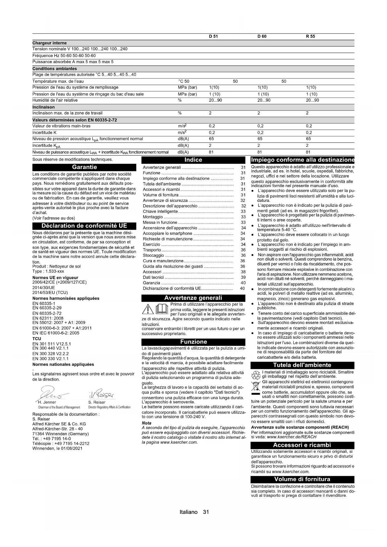 • Les signataires agissent sous ordre et avec le pouvoir de la direction. Responsable de la documentation : S. Reiser Alfred Kärcher SE & Co. KG Alfred-Kärcher-Str. 28 - 40 71364 Winnenden (Germany) Tél. : +49 7195 14-0 Télécopie : +49 7195 14-2212 Winnenden, le 01/08/2021 Indice Avvertenze generali Prima di utilizzare l’apparecchio per la prima volta, leggere le presenti istruzioni per l’uso originali e le allegate avverten- ze di sicurezza. Agire secondo quanto indicato nelle istruzioni. conservare entrambi i libretti per un uso futuro o per un successivo proprietario. Funzione La lavasciugapavimenti è utilizzata per la pulizia a umi- do di pavimenti piani. Regolando la quantità d'acqua, la quantità di detergente e la velocità di marcia, è possibile adattare facilmente l'apparecchio alle rispettive attività di pulizia. L'apparecchio può essere adattato alla relativa attività di pulizia selezionando un programma di pulizia ade- guato. La larghezza di lavoro e la capacità dei serbatoi di ac- qua pulita e sporca (vedere il capitolo "Dati tecnici") consentono una pulizia efficace con una lunga durata. L'apparecchio è semovente. Le batterie possono essere caricate utilizzando il cari- catore incorporato. Il caricabatterie può essere utilizza- to con una tensione di 100-240 V. Nota A seconda del tipo di pulizia da eseguire, l’apparecchio può essere equipaggiato con diversi accessori. Richie- dete il nostro catalogo o visitate il nostro sito internet al- la pagina www.kaercher.com. Impiego conforme alla destinazione Questo apparecchio è adatto all’utilizzo professionale e industriale, ad es. in hotel, scuole, ospedali, fabbriche, negozi, uffici e nel settore della locazione. Utilizzare questo apparecchio esclusivamente in conformità alle indicazioni fornite nel presente manuale d'uso. ● L’apparecchio deve essere utilizzato solo per la pu- lizia di pavimenti lisci resistenti all'umidità e alla luci- datura. ● L’apparecchio non è indicato per la pulizia di pavi- menti gelati (ad es. in magazzini frigoriferi). ● L'apparecchio è progettato per la pulizia di pavimen- ti interni o aree coperte. ● L'apparecchio è adatto all'utilizzo nell'intervallo di temperatura 5-40 °C. ● L'apparecchio deve essere collocato in un luogo protetto dal gelo. ● L’apparecchio non è indicato per l’impiego in am- bienti soggetti al rischio di esplosioni. ● Non aspirare con l'apparecchio gas infiammabili, acidi non diluiti o solventi. Questi comprendono la benzina, diluenti per vernici o l'olio da riscaldamento, che pos- sono formare miscele esplosive in combinazione con l'aria di aspirazione. Non utilizzare nemmeno acetone, acidi non diluiti né solventi, perché danneggiano i ma- teriali utilizzati sull’apparecchio. ● In combinazione con detergenti fortemente alcalini o acidi, le polveri di metallo reattive (ad es. alluminio, magnesio, zinco) generano gas esplosivi. ● L'apparecchio non è destinato alla pulizia di strade pubbliche. ● Tenere conto del carico superficiale ammissibile del- la pavimentazione (vedi capitolo Dati tecnici). ● Sull'apparecchio devono essere montati esclusiva- mente accessori e ricambi originali. ● In caso di impiego di caricabatterie o batterie devo- no essere utilizzati solo i componenti ammessi nelle istruzioni per l'uso. Le combinazioni diverse da quel- le indicate devono essere autorizzate con assunzio- ne di responsabilità da parte del fornitore del caricabatterie e/o della batteria. Tutela dell'ambiente I materiali di imballaggio sono riciclabili. Smaltire gli imballaggi nel rispetto dell’ambiente. Gli apparecchi elettrici ed elettronici contengono materiali riciclabili preziosi e, spesso, componenti come batterie, accumulatori oppure olio che, se usati o smaltiti non correttamente, possono costi- tuire un potenziale pericolo per la salute umana e per l'ambiente. Questi componenti sono tuttavia necessari per un corretto funzionamento dell'apparecchio. Gli ap- parecchi contrassegnati con questo simbolo non devo- no essere smaltiti con i rifiuti domestici. Avvertenze sulle sostanze componenti (REACH) Per informazioni aggiornate sulle sostanze componenti si veda: www.kaercher.de/REACH Accessori e ricambi Utilizzando solamente accessori e ricambi originali, si garantisce un funzionamento sicuro e privo di disturbi dell'apparecchio. Si possono trovare informazioni riguardo ad accessori e ricambi su www.kaercher.com. Volume di fornitura Disimballare la confezione e controllare che il contenuto sia completo. In caso di accessori mancanti o danni do- vuti al trasporto si prega di contattare il rivenditore. Chargeur interne Tension nominale V 100 p. 240