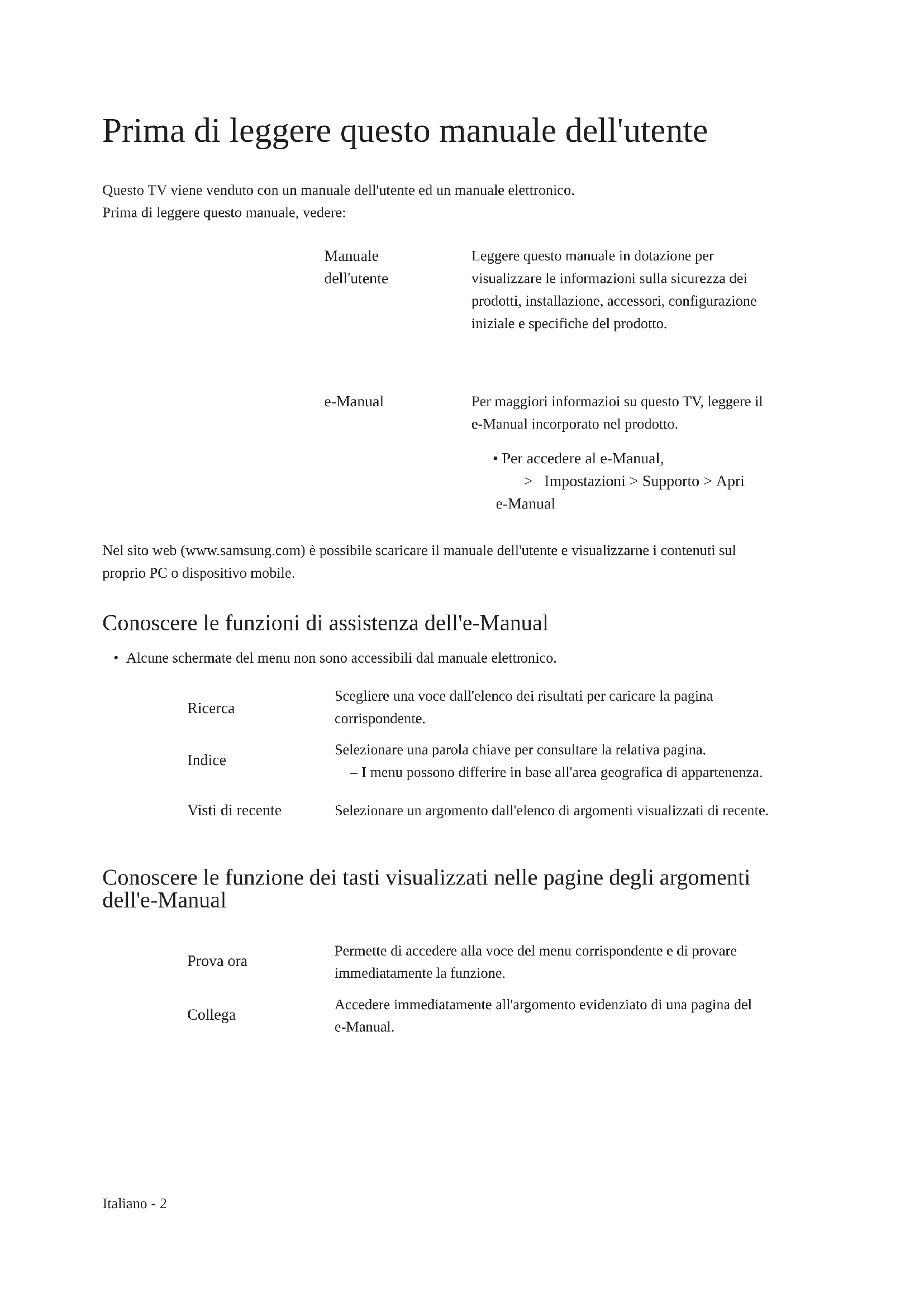 - Per accedere al e-Manual, > Impostazioni > Supporto > Apri e-Manual Nel sito web (www.samsung.com) è possibile scaricare il manuale dell'utente e visualizzarne i contenuti sul proprio PC o dispositivo mobile. Conoscere le funzioni di assistenza dell'e-Manual