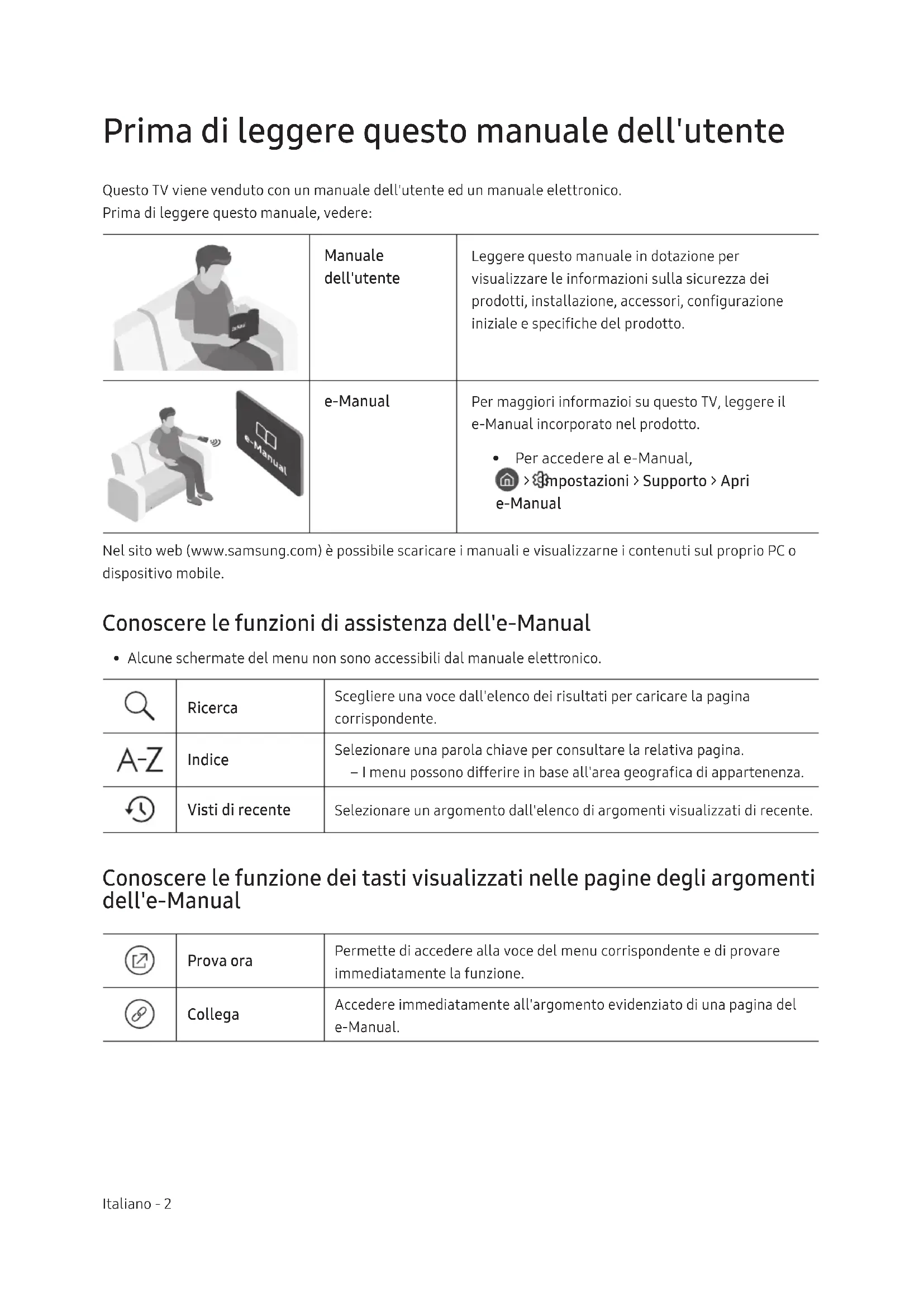 - Per accedere al e-Manual, > Impostazioni > Supporto > Apri e-Manual Nel sito web (www.samsung.com) è possibile scaricare i manuali e visualizzarne i contenuti sul proprio PC o dispositivo mobile. Conoscere le funzioni di assistenza dell'e-Manual