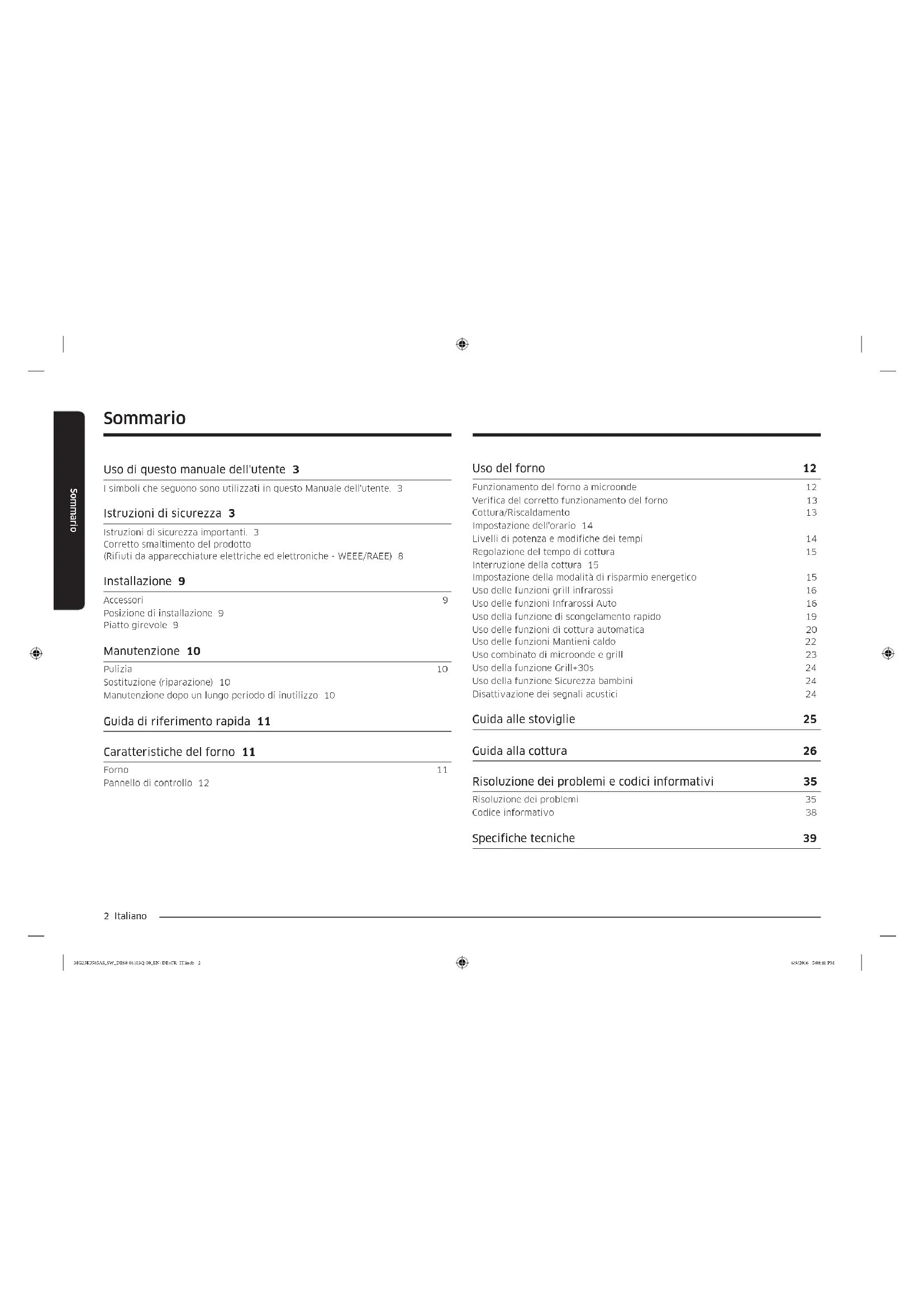 www.samsung.com/be/support (Dutch) www.samsung.com/be_fr/support (French) DENMARK 70 70 19 70 www.samsung.com/dk/support FINLAND 030-6227 515 www.samsung.com/fi/support FRANCE 01 48 63 00 00 www.samsung.com/fr/support GERMANY 0180 6 SAMSUNG bzw. 0180 6 7267864* (*0,20 €/Anruf aus dem dt. Festnetz, aus dem Mobilfunk max. 0,60 €/Anruf) www.samsung.com/de/support ITALIA 800-SAMSUNG (800.7267864) www.samsung.com/it/support CYPRUS 8009 4000 only from landline, toll free www.samsung.com/gr/support GREECE 80111-SAMSUNG (80111 726 7864) only from land line (+30) 210 6897691 from mobile and land line LUXEMBURG 261 03 710 www.samsung.com/be_fr/support NETHERLANDS 0900-SAMSUNG (0900-7267864) (€ 0,10/Min) www.samsung.com/nl/support NORWAY 815 56480 www.samsung.com/no/support PORTUGAL 808 20 7267 www.samsung.com/pt/support SPAIN 0034902172678 www.samsung.com/es/support SWEDEN 0771 726 7864 (0771-SAMSUNG) www.samsung.com/se/support SWITZERLAND 0800 726 78 64 (0800-SAMSUNG) www.samsung.com/ch/support (German) www.samsung.com/ch_fr/support (French) UK 0330 SAMSUNG (7267864) www.samsung.com/uk/support EIRE 0818 717100 www.samsung.com/ie/support DE68-04403Q-00 MG23K3585AS_SW_DE68-04403Q-00_EN+DE+FR+IT.indb 40 6/9/2016 5:08:39 PMForno a microonde Manuale dell'utente MG23K3585** MG23K3585AS_SW_DE68-04403Q-00_EN+DE+FR+IT.indb 1 6/9/2016 5:08:41 PM2 Italiano Sommario Sommario Uso di questo manuale dell'utente 3 I simboli che seguono sono utilizzati in questo Manuale dell'utente. 3 Istruzioni di sicurezza 3 Istruzioni di sicurezza importanti. 3 Corretto smaltimento del prodotto (Rifiuti da apparecchiature elettriche ed elettroniche - WEEE/RAEE) 8 Installazione 9 Accessori 9 Posizione di installazione 9 Piatto girevole 9 Manutenzione 10 Pulizia 10 Sostituzione (riparazione) 10 Manutenzione dopo un lungo periodo di inutilizzo 10 Guida di riferimento rapida 11 Caratteristiche del forno 11 Forno 11 Pannello di controllo 12 Uso del forno 12 Funzionamento del forno a microonde 12 Verifica del corretto funzionamento del forno 13 Cottura/Riscaldamento 13 Impostazione dell'orario 14 Livelli di potenza e modifiche dei tempi 14 Regolazione del tempo di cottura 15 Interruzione della cottura 15 Impostazione della modalità di risparmio energetico 15 Uso delle funzioni grill infrarossi 16 Uso delle funzioni Infrarossi Auto 16 Uso della funzione di scongelamento rapido 19 Uso delle funzioni di cottura automatica 20 Uso delle funzioni Mantieni caldo 22 Uso combinato di microonde e grill 23 Uso della funzione Grill+30s 24 Uso della funzione Sicurezza bambini 24 Disattivazione dei segnali acustici 24 Guida alle stoviglie 25 Guida alla cottura 26 Risoluzione dei problemi e codici informativi 35 Risoluzione dei problemi 35 Codice informativo 38 Specifiche tecniche 39 MG23K3585AS_SW_DE68-04403Q-00_EN+DE+FR+IT.indb 2 6/9/2016 5:08:41 PMItaliano 3 Uso del manuale dell'utente Istruzioni di sicurezza ISTRUZIONI DI SICUREZZA IMPORTANTI.