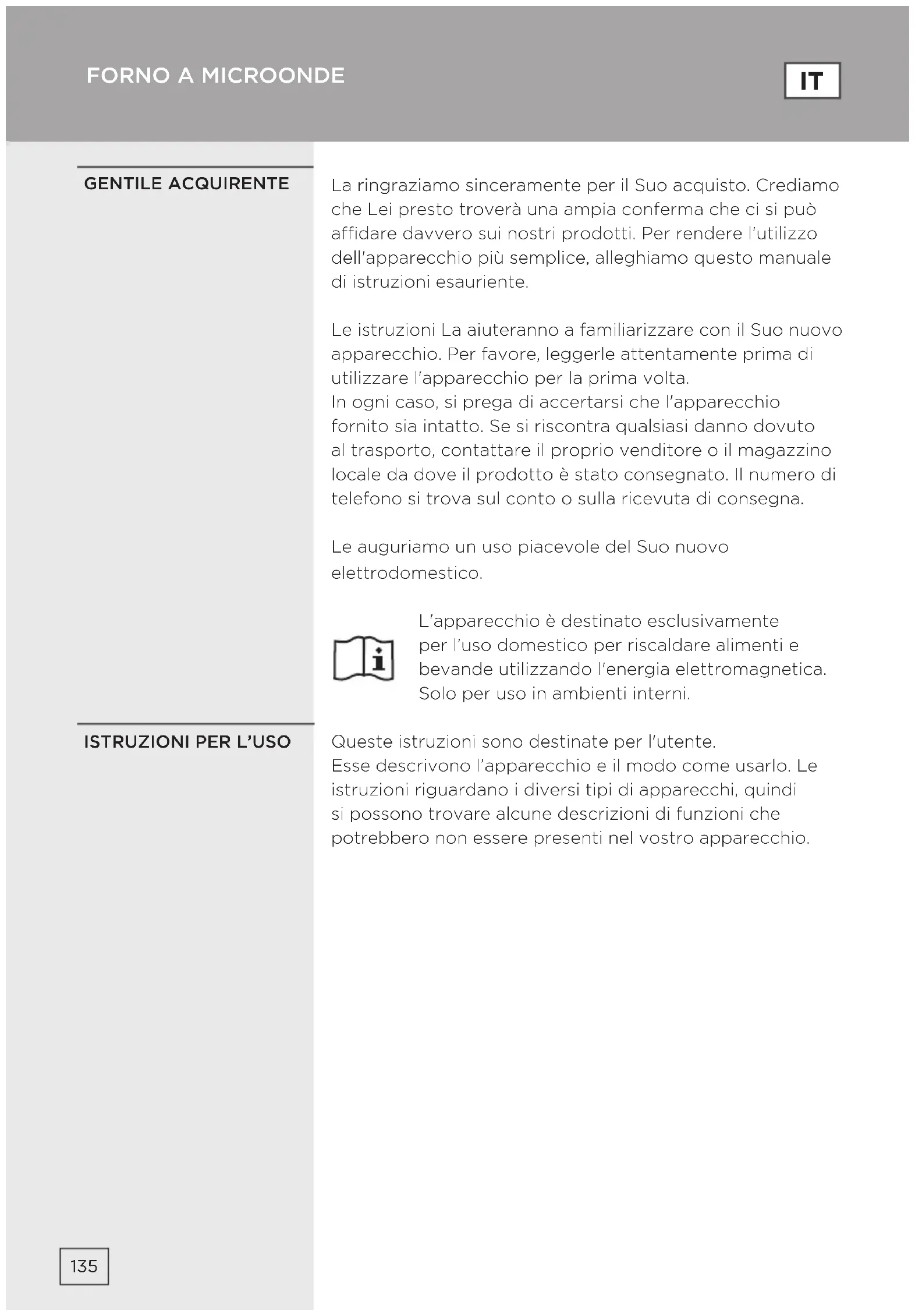 ANTES DE LLAMAR AL CENTRO DE REPARACIONES GARANTÍA Y SERVICIOLa ringraziamo sinceramente per il Suo acquisto. Crediamo che Lei presto troverà una ampia conferma che ci si può adare davvero sui nostri prodotti. Per rendere l'utilizzo dell'apparecchio più semplice, alleghiamo questo manuale di istruzioni esauriente. Le istruzioni La aiuteranno a familiarizzare con il Suo nuovo apparecchio. Per favore, leggerle attentamente prima di utilizzare l'apparecchio per la prima volta. In ogni caso, si prega di accertarsi che l'apparecchio fornito sia intatto. Se si riscontra qualsiasi danno dovuto al trasporto, contattare il proprio venditore o il magazzino locale da dove il prodotto è stato consegnato. Il numero di telefono si trova sul conto o sulla ricevuta di consegna. Le auguriamo un uso piacevole del Suo nuovo elettrodomestico. L'apparecchio è destinato esclusivamente per l’uso domestico per riscaldare alimenti e bevande utilizzando l'energia elettromagnetica. Solo per uso in ambienti interni. Queste istruzioni sono destinate per l'utente. Esse descrivono l’apparecchio e il modo come usarlo. Le istruzioni riguardano i diversi tipi di apparecchi, quindi si possono trovare alcune descrizioni di funzioni che potrebbero non essere presenti nel vostro apparecchio. GENTILE ACQUIRENTE