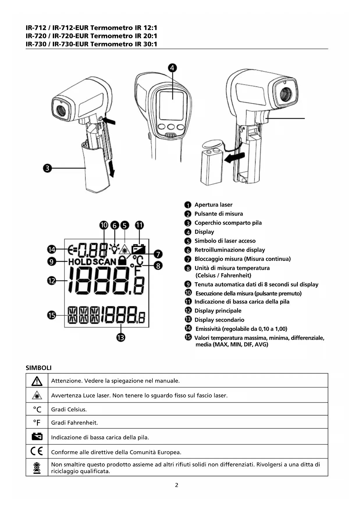 Attenzione. Vedere la spiegazione nel manuale.Avvertenza Luce laser. Non tenere lo sguardo fisso sul fascio laser. Gradi Celsius. Gradi Fahrenheit.Indicazione di bassa carica della pila. Conforme alle direttive della Comunità Europea. Non smaltire questo prodotto assieme ad altri rifiuti solidi non differenziati. Rivolgersi a una ditta di riciclaggio qualificata. IR-712 / IR-712-EUR Termometro IR 12:1 IR-720 / IR-720-EUR Termometro IR 20:1 IR-730 / IR-730-EUR Termometro IR 30:1