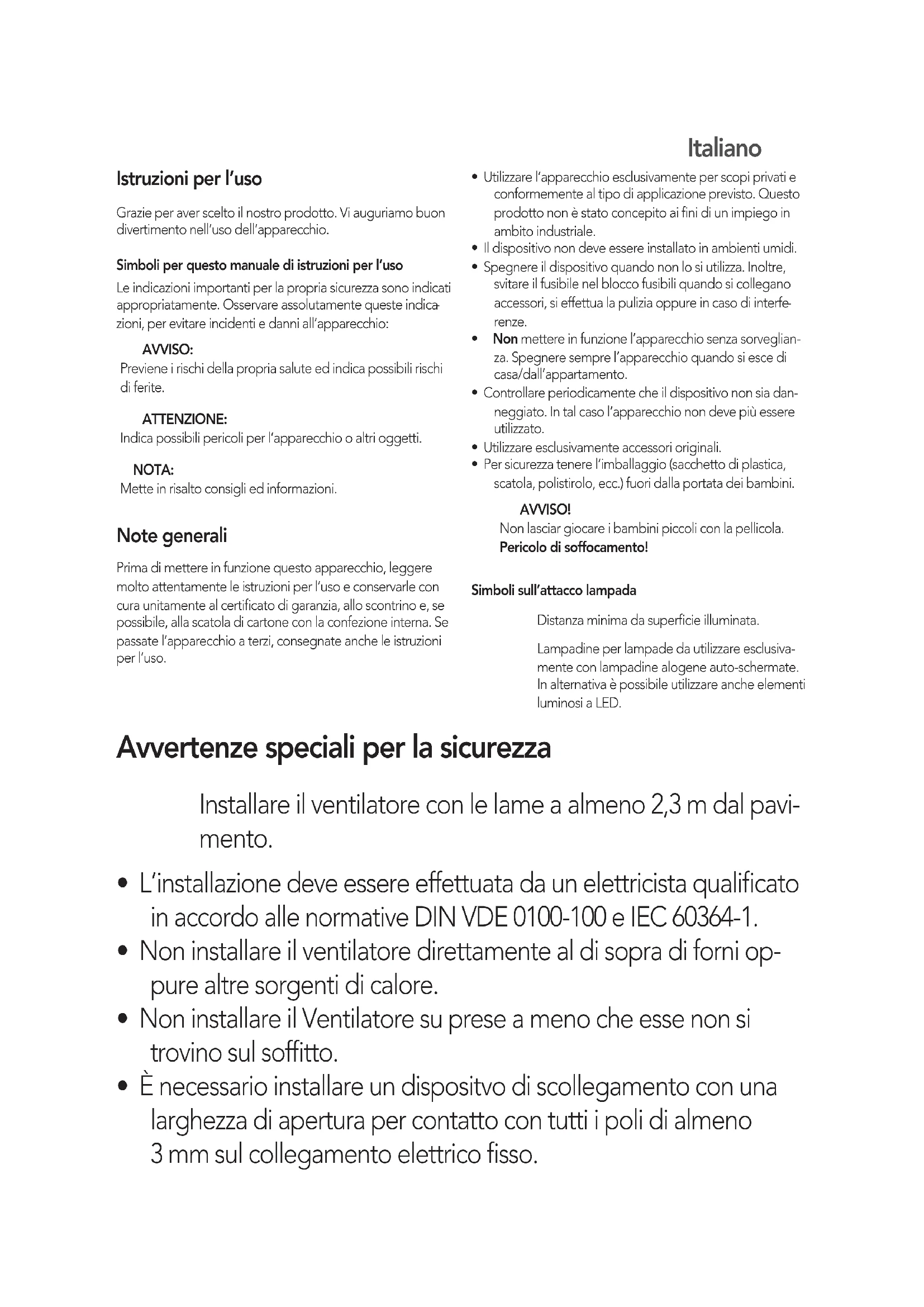 - Non mettere in funzione l’apparecchio senza sorveglian- za. Spegnere sempre l’apparecchio quando si esce di casa/dall’appartamento.• Controllare periodicamente che il dispositivo non sia dan-neggiato. In tal caso l‘apparecchio non deve più essere utilizzato.• Utilizzare esclusivamente accessori originali.• Per sicurezza tenere l’imballaggio (sacchetto di plastica, scatola, polistirolo, ecc.) fuori dalla portata dei bambini. AVVISO! Non lasciar giocare i bambini piccoli con la pellicola. Pericolo di soffocamento!Simboli sull’attacco lampadaDistanza minima da superficie illuminata.Lampadine per lampade da utilizzare esclusiva-mente con lampadine alogene auto-schermate. In alternativa è possibile utilizzare anche elementi luminosi a LED. Avvertenze speciali per la sicurezza Installare il ventilatore con le lame a almeno 2,3 m dal pavi- mento.