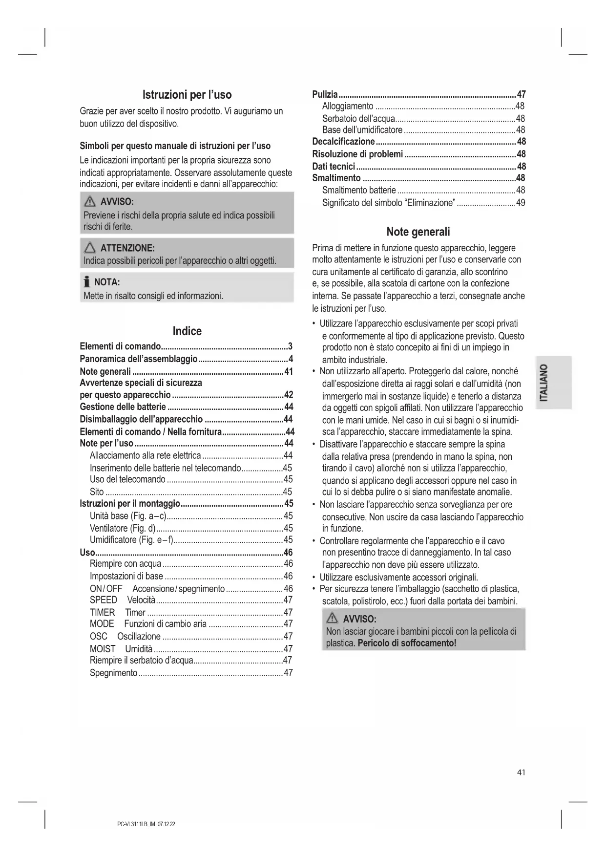 - Dopo aver spento e riacceso nuovamente il dispositivo utilizzando il tasto ON / OFF, il dispositivo continua a funzionare nell’ultima modalità impostata.PC-VL3111LB_IM 07.12.22
