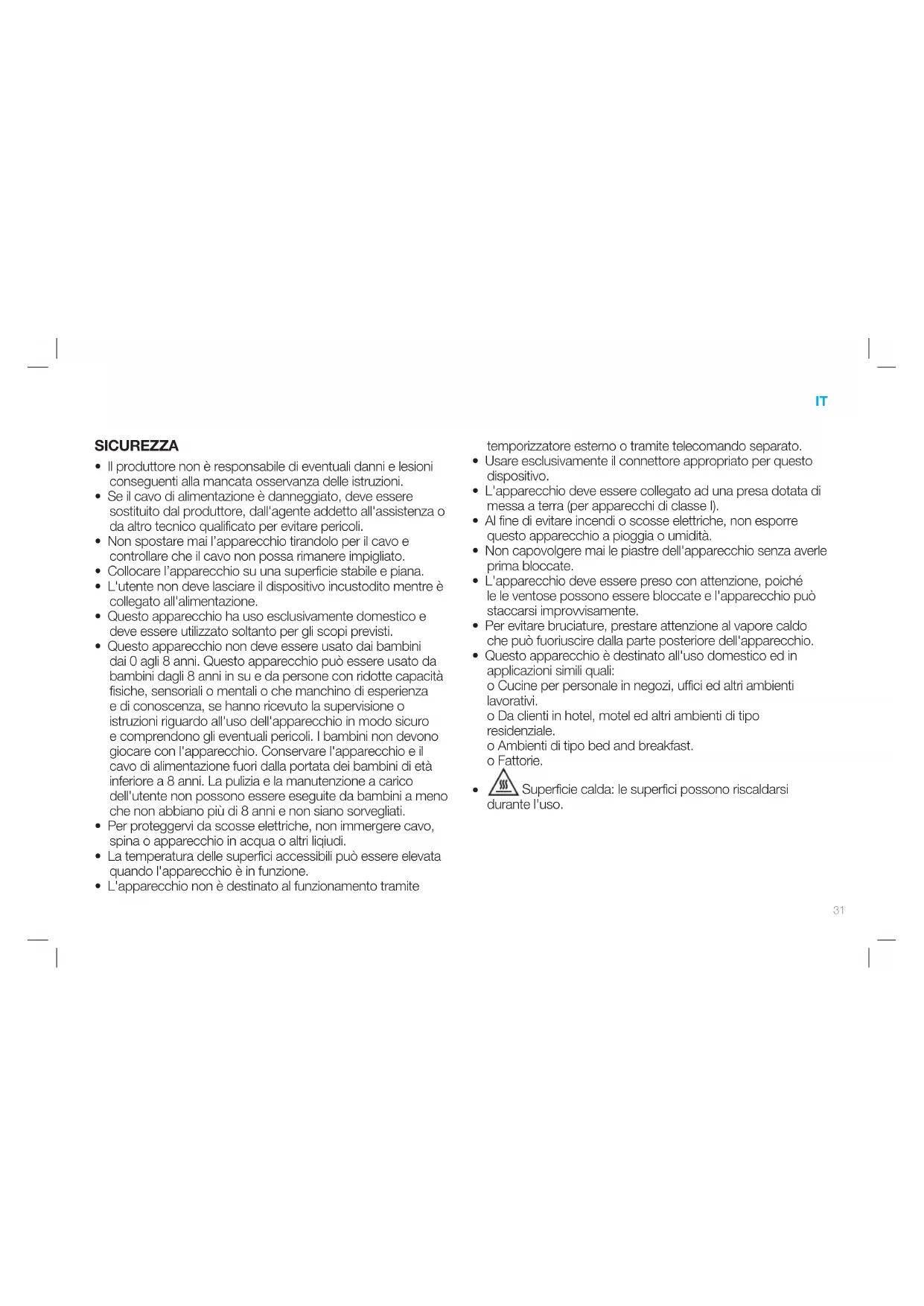 - Questo apparecchio non deve essere usato dai bambini dai 0 agli 8 anni. Questo apparecchio può essere usato da bambini dagli 8 anni in su e da persone con ridotte capacità fisiche, sensoriali o mentali o che manchino di esperienza e di conoscenza, se hanno ricevuto la supervisione o istruzioni riguardo all'uso dell'apparecchio in modo sicuro e comprendono gli eventuali pericoli. I bambini non devono giocare con l'apparecchio. Conservare l'apparecchio e il cavo di alimentazione fuori dalla portata dei bambini di età inferiore a 8 anni. La pulizia e la manutenzione a carico dell'utente non possono essere eseguite da bambini a meno che non abbiano più di 8 anni e non siano sorvegliati.