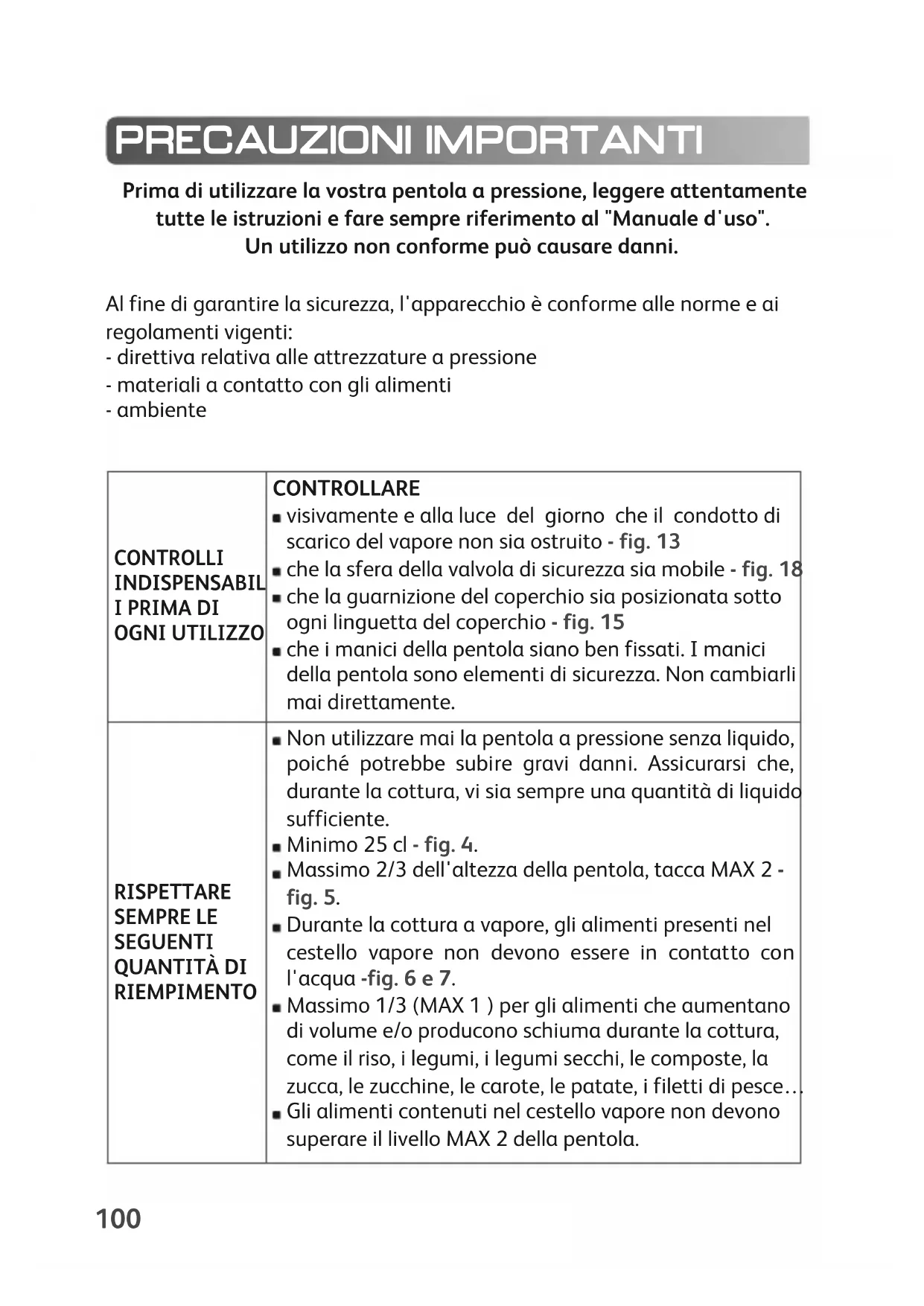OGNI UTILIZZO CONTROLLARE visivamente e alla luce del giorno che il condotto di scarico del vapore non sia ostruito - fig. 13 che la sfera della valvola di sicurezza sia mobile - fig. 18 che la guarnizione del coperchio sia posizionata sotto ogni linguetta del coperchio - fig. 15 che i manici della pentola siano ben fissati. I manici della pentola sono elementi di sicurezza. Non cambiarli mai direttamente. RISPETTARE SEMPRE LE SEGUENTI QUANTITÀ DI RIEMPIMENTO Non utilizzare mai la pentola a pressione senza liquido, poiché potrebbe subire gravi danni. Assicurarsi che, durante la cottura, vi sia sempre una quantità di liquido sufficiente. Minimo 25 cl - fig. 4. Massimo 2/3 dell'altezza della pentola, tacca MAX 2 - fig. 5. Durante la cottura a vapore, gli alimenti presenti nel cestello vapore non devono essere in contatto con l'acqua -fig. 6 e 7. Massimo 1/3 (MAX 1 ) per gli alimenti che aumentano di volume e/o producono schiuma durante la cottura, come il riso, i legumi, i legumi secchi, le composte, la zucca, le zucchine, le carote, le patate, i filetti di pesce… Gli alimenti contenuti nel cestello vapore non devono superare il livello MAX 2 della pentola.101