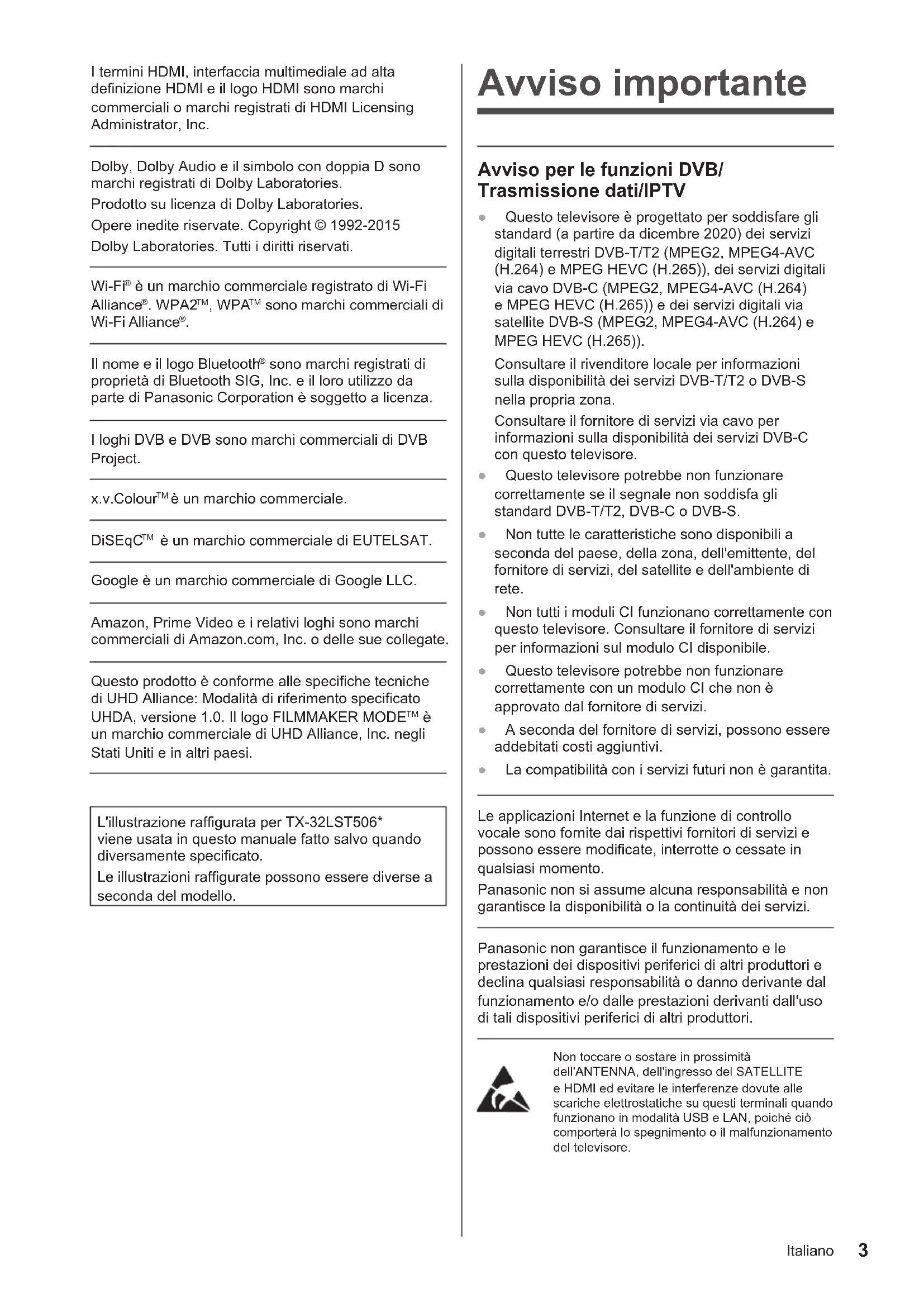 un marchio commerciale di UHD Alliance, Inc. negli Stati Uniti e in altri paesi. L'illustrazione raffigurata per TX-32LST506* viene usata in questo manuale fatto salvo quando diversamente specificato. Le illustrazioni raffigurate possono essere diverse a seconda del modello. Avviso importante Avviso per le funzioni DVB/ Trasmissione dati/IPTV ● Questo televisore è progettato per soddisfare gli standard (a partire da dicembre 2020) dei servizi digitali terrestri DVB-T/T2 (MPEG2, MPEG4-AVC (H.264) e MPEG HEVC (H.265)), dei servizi digitali via cavo DVB-C (MPEG2, MPEG4-AVC (H.264) e MPEG HEVC (H.265)) e dei servizi digitali via satellite DVB-S (MPEG2, MPEG4-AVC (H.264) e MPEG HEVC (H.265)). Consultare il rivenditore locale per informazioni sulla disponibilità dei servizi DVB-T/T2 o DVB-S nella propria zona. Consultare il fornitore di servizi via cavo per informazioni sulla disponibilità dei servizi DVB-C con questo televisore. ● Questo televisore potrebbe non funzionare correttamente se il segnale non soddisfa gli standard DVB-T/T2, DVB-C o DVB-S. ● Non tutte le caratteristiche sono disponibili a seconda del paese, della zona, dell'emittente, del fornitore di servizi, del satellite e dell'ambiente di rete. ● Non tutti i moduli CI funzionano correttamente con questo televisore. Consultare il fornitore di servizi per informazioni sul modulo CI disponibile. ● Questo televisore potrebbe non funzionare correttamente con un modulo CI che non è approvato dal fornitore di servizi. ● A seconda del fornitore di servizi, possono essere addebitati costi aggiuntivi. ● La compatibilità con i servizi futuri non è garantita. Le applicazioni Internet e la funzione di controllo vocale sono fornite dai rispettivi fornitori di servizi e possono essere modificate, interrotte o cessate in qualsiasi momento. Panasonic non si assume alcuna responsabilità e non garantisce la disponibilità o la continuità dei servizi. Panasonic non garantisce il funzionamento e le prestazioni dei dispositivi periferici di altri produttori e declina qualsiasi responsabilità o danno derivante dal funzionamento e/o dalle prestazioni derivanti dall'uso di tali dispositivi periferici di altri produttori. Non toccare o sostare in prossimità dell'ANTENNA, dell'ingresso del SATELLITE e HDMI ed evitare le interferenze dovute alle scariche elettrostatiche su questi terminali quando funzionano in modalità USB e LAN, poiché ciò comporterà lo spegnimento o il malfunzionamento del televisore.Italiano