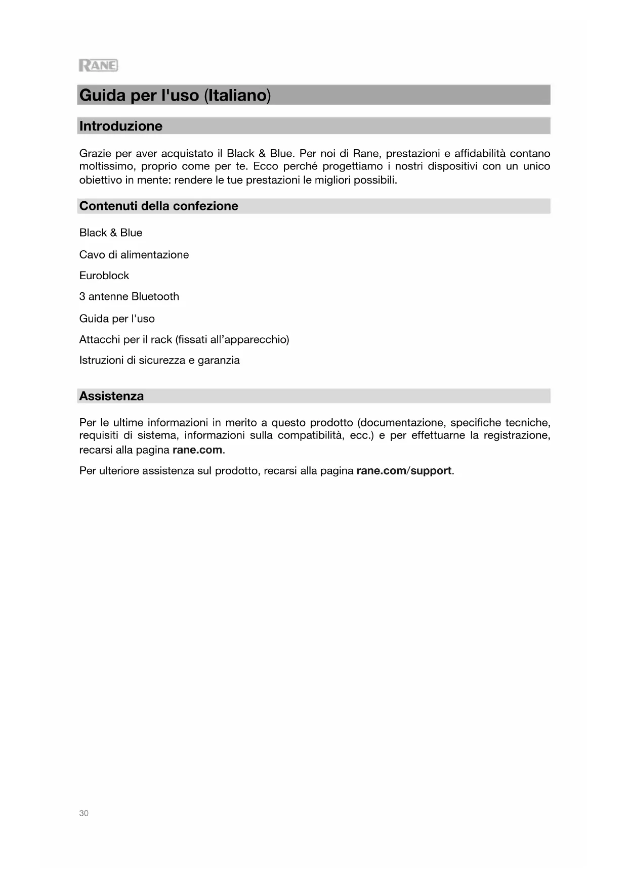 Guida per l'uso (Italiano) Introduzione Grazie per aver acquistato il Black & Blue. Per noi di Rane, prestazioni e affidabilità contano moltissimo, proprio come per te. Ecco perché progettiamo i nostri dispositivi con un unico obiettivo in mente: rendere le tue prestazioni le migliori possibili. Contenuti della confezione Black & Blue Cavo di alimentazione Euroblock 3 antenne Bluetooth Guida per l'uso Attacchi per il rack (fissati all’apparecchio) Istruzioni di sicurezza e garanzia Assistenza Per le ultime informazioni in merito a questo prodotto (documentazione, specifiche tecniche, requisiti di sistema, informazioni sulla compatibilità, ecc.) e per effettuarne la registrazione, recarsi alla pagina rane.com. Per ulteriore assistenza sul prodotto, recarsi alla pagina rane.com/support.31