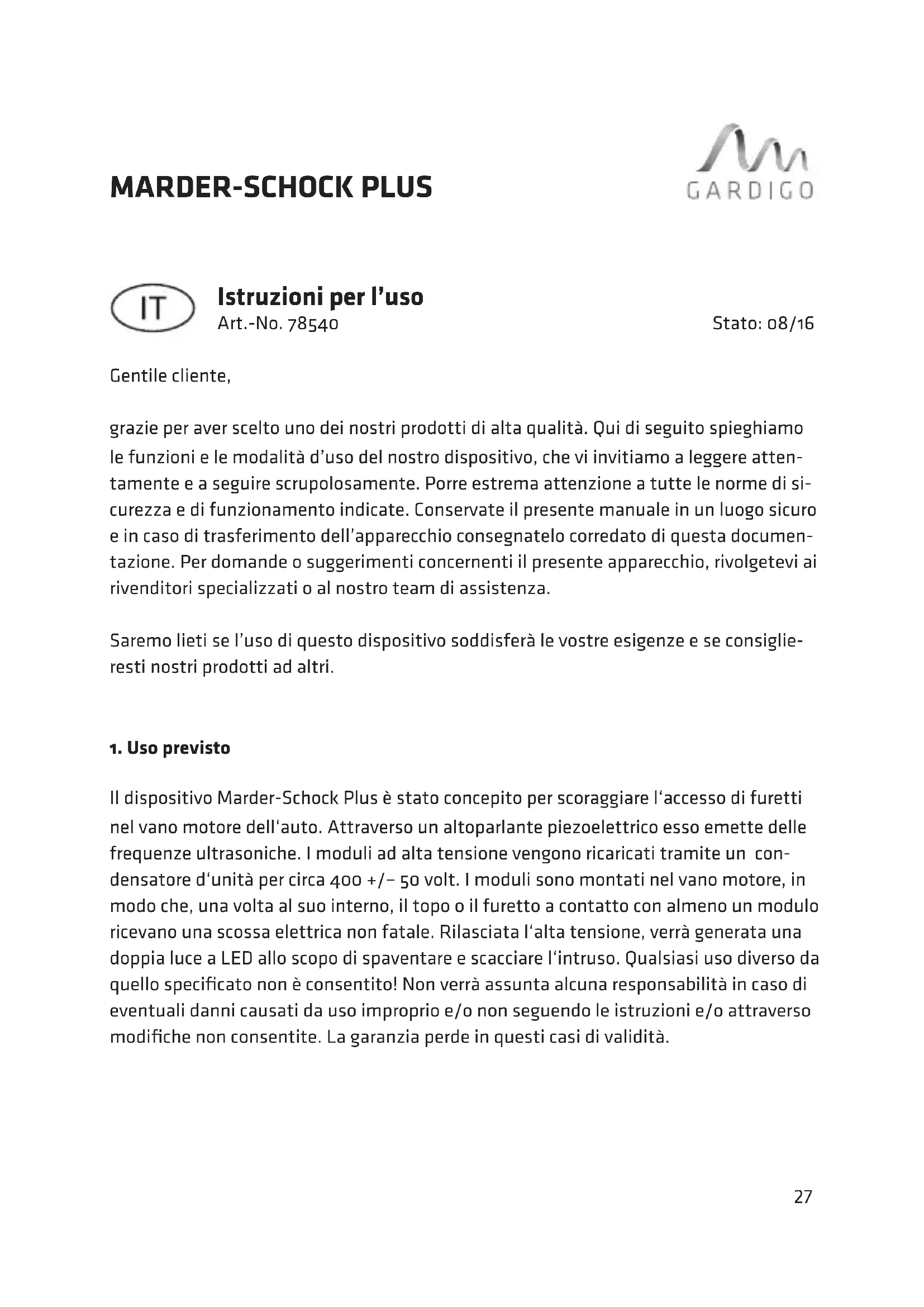 Il dispositivo Marder-Schock Plus è stato concepito per scoraggiare l‘accesso di furetti nel vano motore dell‘auto. Attraverso un altoparlante piezoelettrico esso emette delle frequenze ultrasoniche. I moduli ad alta tensione vengono ricaricati tramite un con- densatore d‘unità per circa 400 +/– 50 volt. I moduli sono montati nel vano motore, in modo che, una volta al suo interno, il topo o il furetto a contatto con almeno un modulo ricevano una scossa elettrica non fatale. Rilasciata l‘alta tensione, verrà generata una doppia luce a LED allo scopo di spaventare e scacciare l‘intruso. Qualsiasi uso diverso da quello specificato non è consentito! Non verrà assunta alcuna responsabilità in caso di eventuali danni causati da uso improprio e/o non seguendo le istruzioni e/o attraverso modifiche non consentite. La garanzia perde in questi casi di validità. Stato: 08/1628
